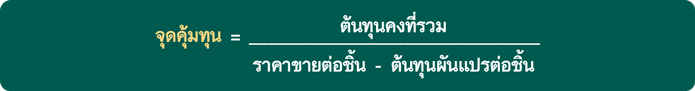 การหาจุดที่ทำธุรกิจแล้วคุ้มค่ากับการดำเนินงาน เราเรียกว่าจุดคุ้มทุน ซึ่งก็คือจุดที่ธุรกิจมีรายได้จากยอดขายเท่ากับต้นทุน โดยถ้าหากเอสเอ็มอีสามารถทำยอดขายได้มากกว่าจุดค้มทุนที่คำนวณได้ก็แสดงว่าธุรกิจมีกำไร แต่ถ้ายอดขายต่ำกว่าค่าจุดคุ้มทุนที่คำนวณได้นั่นคือธุรกิจมีต้นทุนมากกว่ารายได้หรือขาดทุน แปลว่าไม่คุ้มค่ากับการดำเนินงาน ดังนั้นการทำธุรกิจเราต้องรู้จุดคุ้มทุนซึ่งสามารถคำนวณได้ดังนี้