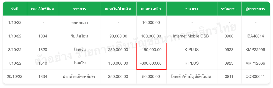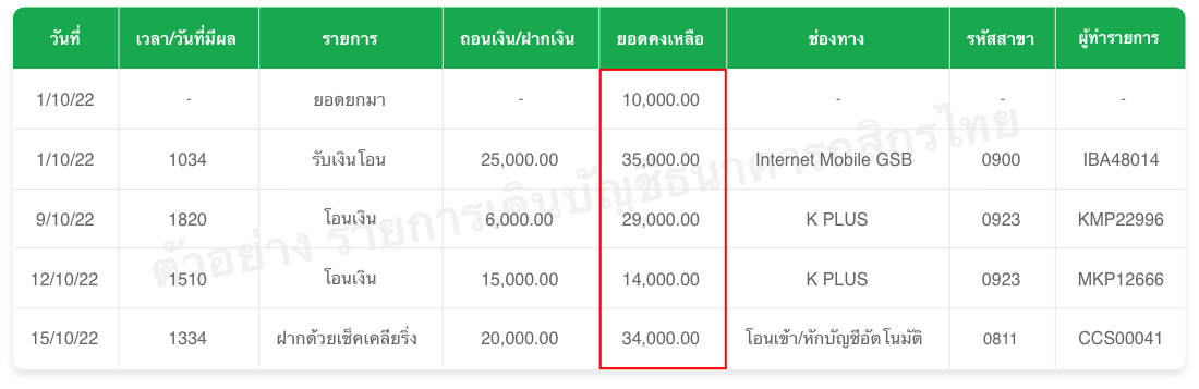แต่ถ้าเป็นบัญชีกระแสรายวันที่ไม่มีวงเงินกู้เบิกเงินเกินบัญชีผูกอยู่ ธนาคารมีสิทธิปฏิเสธไม่ทำรายการเบิกถอนเงินจากบัญชีดังกล่าวเกินกว่ายอดเงินฝากที่มีอยู่ในบัญชี โดยรายการเดินบัญชี หรือ Statement จะมียอดเป็นบวกเท่านั้น จากตัวอย่างรายการเดินบัญชีกระแสรายวันด้านล่างจะพบว่า มียอดคงเหลือเป็นบวกหรือตัวดำทุกรายการ (แต่จะไม่ได้แสดงเครื่องหมายบวกไว้ให้เห็น) ซึ่งยอดคงเหลือที่แสดงไว้จะหมายถึงยอดที่สามารถเบิกถอนได้ ตัวอย่างเช่น ถ้าต้องการเบิกเงิน ในวันที่ 15 / 10 จะสามารถเบิกได้ไม่เกิน 34,000 บาท
