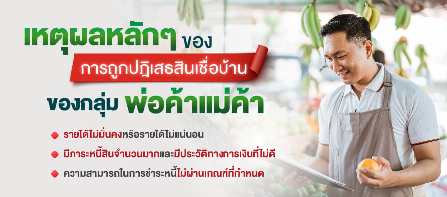 ความฝันที่จะมี “บ้าน” เป็นของตนเองสักหลัง คงไม่ใช่เรื่องยากสำหรับคนที่สามารถซื้อได้ด้วยเงินสด แต่ถ้าต้องซื้อด้วยการกู้เงิน ถ้าเป็นกลุ่มคนที่มีรายได้ประจำหรือคนกินเงินเดือนก็ไม่ใช่เรื่องยากเช่นกัน แต่ถ้าเป็นกลุ่มพ่อค้าแม่ค้าตลาดสด ตลาดนัด หรือรถเข็น หากต้องการกู้เงินเพื่อซื้อบ้านสักหลัง มักถูกปฏิเสธจากธนาคารด้วยเหตุผลหลักๆ* ดังนี้