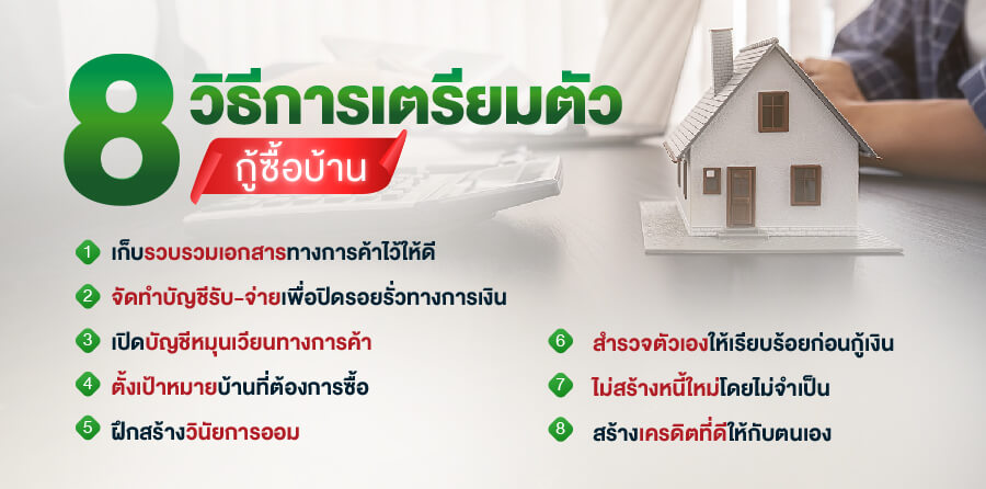 เมื่อได้รู้เหตุผลหลักๆ แล้วว่าทำไมสินเชื่อบ้านมักถูกปฎิเสธจากธนาคาร หลายคนจึงได้สอบถามเข้ามาที่ธนาคาร หากต้องการกู้เงินซื้อบ้านต้องเตรียมตัวอย่างไรบ้าง1 ซึ่งวิธีการเตรียมตัวที่จะแนะนำให้พ่อค้าแม่ค้าสามารถทำได้ด้วยตนเอง แต่ต้องทำตั้งแต่เนิ่นๆ โดยไม่มีความจำเป็นต้องหันไปใช้บริการจากนายหน้าเถื่อน สำหรับวิธีการเตรียมตัวกู้ซื้อบ้านมีเรื่องที่ต้องเตรียมหลัก 8 ข้อด้วยกัน มีรายละเอียดดังต่อไปนี้