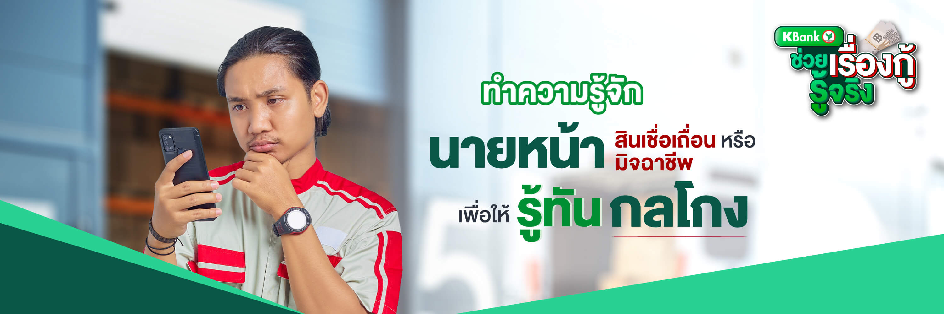 คนที่ต้องการกู้เงินแล้วกลัวว่าจะทำไม่เป็น หรือกลัวว่าจะกู้ไม่ผ่าน ซึ่งกำลังมีความคิดที่จะไปใช้บริการจากนายหน้าเถื่อน หรือนายหน้ามิจฉาชีพ อาจจะต้องกลับมาคิดทบทวนใหม่ เพราะการที่จะกู้ผ่านหรือไม่ผ่านมาจากคุณสมบัติของตัวผู้กู้เอง ถ้ามีคุณสมบัติที่ดีก็สามารถกู้ผ่านได้ แต่ถ้ามีคุณสมบัติที่ไม่ดี เช่น กู้แล้วไม่ยอมผ่อน ซึ่งธนาคารจะปฏิเสธการขอกู้เงิน กรณีเช่นนี้นายหน้าเถื่อนก็ไม่สามารถช่วยให้กู้ผ่านได้ ซึ่งที่ผ่านมาธนาคารมีการทำเครื่องมือช่วยให้คนกู้สามารถทำเรื่องกู้เงินออนไลน์ได้ด้วยตนเอง หากกังวลว่าจะทำไม่เป็นหรือทำไม่ถูก สามารถปรึกษาได้จากช่องทางอย่างเป็นทางการของธนาคาร เช่นช่องทาง LINE @kbanklive หรือ K-Contact Center 02-8888888 กด 8 กด 1 กด 4 ได้ตลอด 24 ชั่วโมง หรือติดต่อผ่านสาขาที่สะดวกได้เช่นกัน ซึ่งเจ้าหน้าที่ทุกคนยินดีให้ความช่วยเหลือคนที่ต้องการกู้ด้วยความตั้งใจและด้วยความเต็มใจ