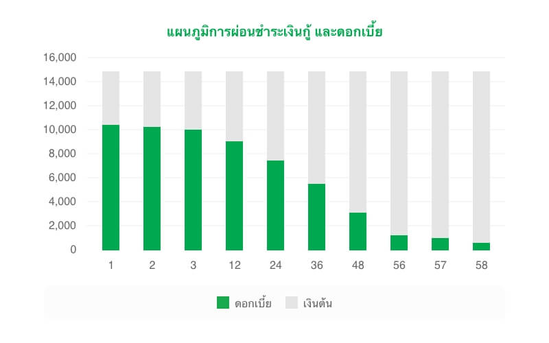 จากแผนภูมิแสดงการผ่อนชำระเงินกู้และดอกเบี้ย* (ยกตัวอย่างการผ่อนชำระในแต่ละช่วง ไม่ได้แสดงทั้งหมด) ในช่วงแรกของการผ่อน (งวดที่ 1) จะเสียดอกเบี้ย 10,274 บาท ส่วนเงินต้นจะอยู่ที่ 4,426 บาท พอผ่อนไปได้สักระยะจนถึงวดที่ 48 ดอกเบี้ยอยู่ที่ 3,187 บาท และตัดเงินต้นได้มากถึง 11,513 บาท ซึ่งการผ่อนในลักษณะนี้จะเสียดอกเบี้ยลดหลั่นกันลงมาตลอดตั้งแต่งวดที่ 1 จนถึงงวดสุดท้ายของการผ่อน เพราะจะถูกคิดดอกเบี้ยจากยอดหนี้ที่ลดลงในแต่ละงวด