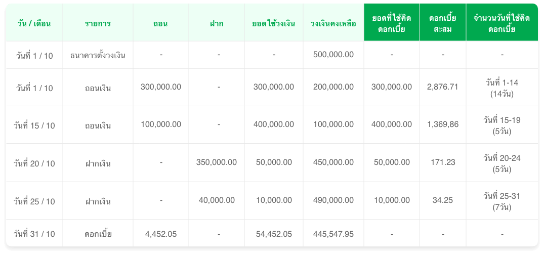จากตารางการใช้วงเงิน* จะเห็นได้ว่าหลังจากที่ธนาคารได้ตั้งวงเงินไปแล้ว ได้มีการเบิกใช้ทันทีในวันที่ 1 จำนวน 300,000 บาท เบิกใช้ครั้งที่ 2 ในวันที่ 15 จำนวน 100,000 บาท รวม 400,000 บาท จากนั้นได้นำเงินมาเข้าในวันที่ 20 จำนวน 350,000 บาท เหลือยอดที่เบิกใช้ไป 50,000 บาท และในวันที่ 25 นำเงินมาเข้าอีกครั้ง จำนวน 40,000 บาท เหลือยอดที่เบิกใช้ไป 10,000 บาท เมื่อถึงวันที่ 31 ระบบได้คำนวณแล้วมีดอกเบี้ย จำนวน 4,452.05 บาท ซึ่งเป็นการคำนวณจากยอดใช้จริง ไม่ได้คำนวณจากวงเงินที่ได้รับ