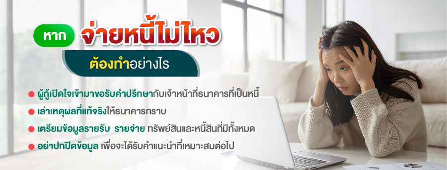 เมื่อถึงกำหนดที่ต้องจ่ายหนี้ แต่ผู้กู้ไม่สามารถจ่ายหนี้ได้ด้วยเหตุผลใดก็ตาม และมักจะหลงเชื่อคำแนะนำจากกูรูในโลกโซเชียลที่มักจะแนะนำให้ "ไม่ต้องไปจ่ายหนี้ รอให้ธนาคารฟ้อง" ซึ่งหลายๆ คนที่หลงเชื่อมักจะปฏิบัติตาม โดยไม่ได้คำนึงถึงผลเสียที่จะตามมาอีกเป็นจำนวนมาก ซึ่งการเป็นหนี้แล้วไม่จ่ายเป็นเรื่องที่เสียหายมากกว่าที่คิด ดังนั้น หากเริ่มจ่ายหนี้ไม่ไหวแล้ว จะมีเจ้าหน้าที่ธนาคารโทร.ติดตาม ผู้กู้อย่ากดสายทิ้ง แต่ให้รับสาย และแจ้งกับเจ้าหน้าที่ได้ทันที เพื่อขอรับความช่วยเหลือจากธนาคาร หรือถ้ามีเจ้าหน้าที่ธนาคารดูแลสินเชื่อให้ สามารถติดต่อได้โดยตรงเช่นกัน แต่หากไม่รู้ว่าจะติดต่อกับใคร สามารถสอบถามได้ที่ LINE @kbanklive หรือ K-Contact Center 02-8888888 กด 8 กด 1 กด 4 ได้ตลอด 24 ชั่วโมง หรือติดต่อผ่านสาขาของธนาคารที่สะดวกได้เช่นกัน ซึ่งทางสาขาจะประสานงานเพื่อส่งเรื่องต่อให้กับผู้มีหน้าที่รับผิดชอบต่อไป หากมีหนี้ไม่มีหลักประกันกับหลายสถาบันการเงินติดต่อ คลีนิคแก้ไขหนี้ โทร.1443 หรือ ศึกษารายละเอียดเพิ่มเติม