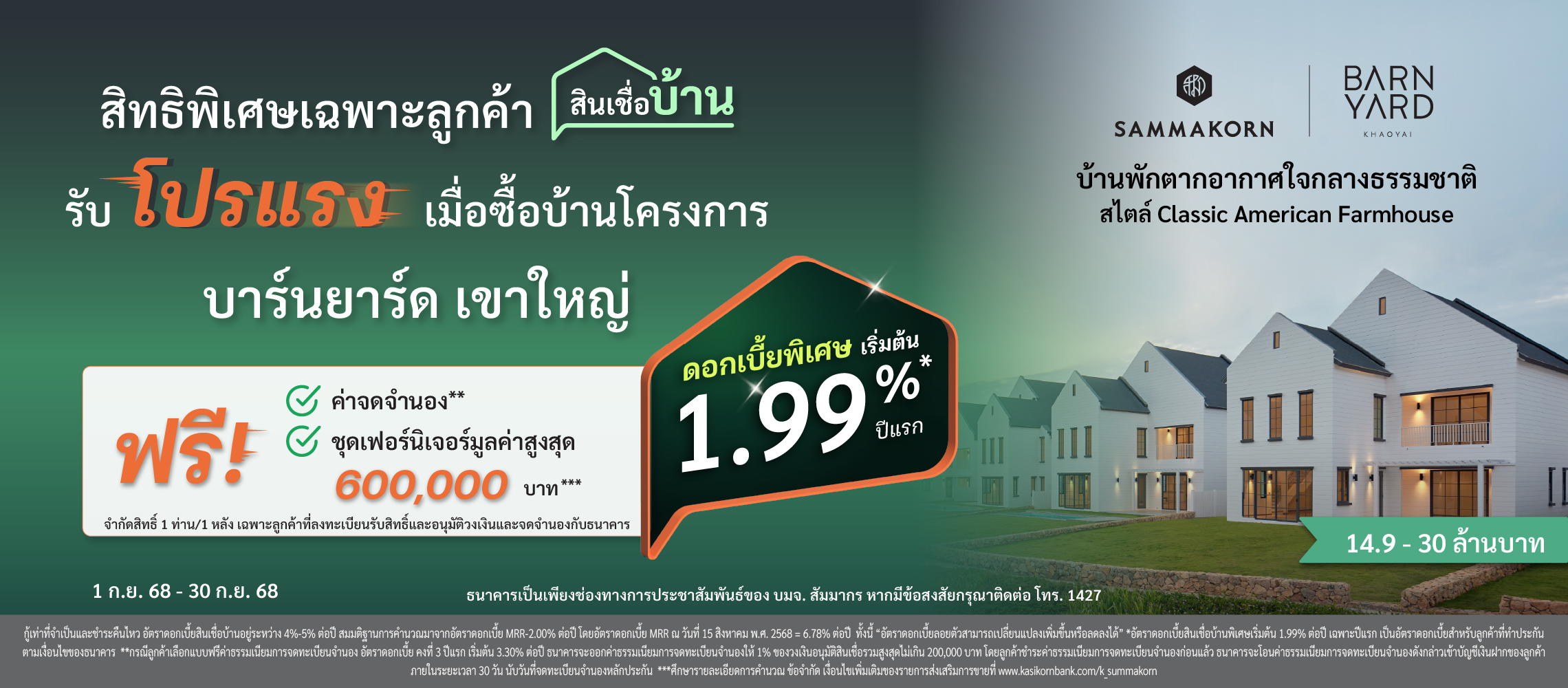 1. รายการส่งเสริมการขายนี้เฉพาะลูกค้าที่จองบ้านในโครงการบาร์นยาร์ด เขาใหญ่ (BARNYARD KHAOYAI) และยื่นขอสินเชื่อและจดทะเบียนจำนองสินเชื่อบ้านกับ บมจ.ธนาคารกสิกรไทย (“ธนาคาร") ตั้งแต่วันที่ 16 กรกฎาคม 2568 – วันที่ 30 กันยายน 2568 (“ระยะเวลาส่งเสริมการขาย")