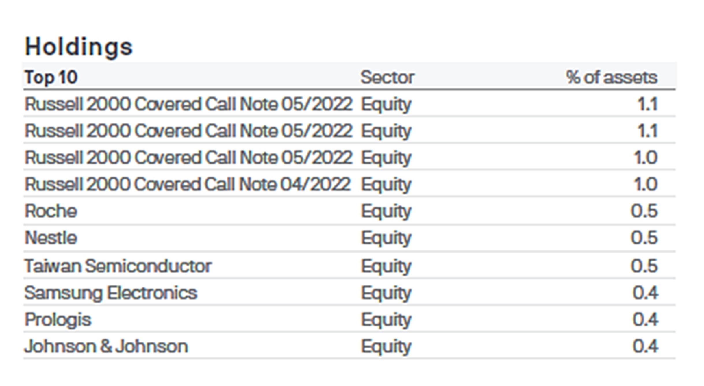 ยิ่งลงทุนหลากหลาย ยิ่งลดผลกระทบที่สินทรัพย์ใดสินทรัพย์หนึ่งจะขาดทุน สำหรับกองทุนรวมนอกจากดูที่นโยบายการลงทุนว่าลงทุนในสินทรัพย์ประเภทใดบ้างแล้ว ควรเช็ก Top Holding ของกองทุนด้วย เช่น K-GINCOME-A(R) ณ 31 มี.ค. 65 มี Top Holding 10 ลำดับแรกตามรูป โดยสินทรัพย์ที่ลงทุนมากที่สุดคิดเป็นสัดส่วน 1.1% และสินทรัพย์ 10 ลำดับแรก มีสัดส่วนรวมกันเพียง 6.9% แสดงให้เห็นถึงจำนวนสินทรัพย์ที่หลากหลายของกองทุนนี้