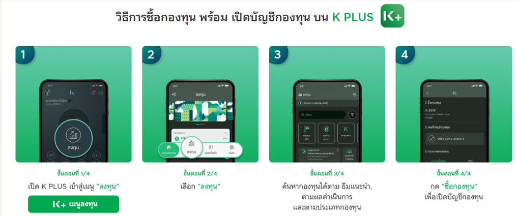 สำหรับการเริ่มต้นลงทุนกองทุนปันผลเป็นเรื่องง่ายมาก ซึ่งวิธีลงทุนที่นักลงทุนหลายคนนิยมใช้เพราะใช้งานง่ายและสะดวกรวดเร็วคือ การลงทุนผ่านแอปพลิเคชัน K PLUS หากใครยังไม่มีบัญชีกองทุนก็สามารถเปิดบัญชีกองทุนออนไลน์ได้เลย