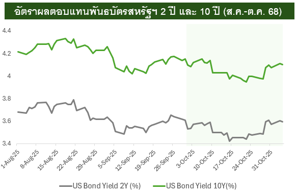 ในเดือนต.ค. Bond Yield สหรัฐฯ ปรับตัวลดลง โดย US Bond Yield 2 ปีปรับตัวลดลงจาก 3.6% เป็น 3.57% และUS Bond Yield 10 ปีปรับตัวลดลงจาก 4.15% มาอยู่ที่ 4.07% จากการเปิดเผยข้อมูลคาดการณ์เศรษฐกิจออกมาอ่อนแอกว่าคาด นอกจากนี้ นักลงทุนบางส่วนมีความกังวลต่อปัญหาสินเชื่อ หลังมีการล้มละลายของ 2 บริษัท คือ Zions Bancorp และ Western Alliance Bancorp เมื่อรวมกับความตึงเครียดทางการค้าระหว่างสหรัฐฯ-จีน และประเด็น Government Shutdown ที่ยังคงอยู่ ทำให้นักลงทุนบางส่วนเริ่มลดความเสี่ยงของพอร์ตลงและกลับเข้าซื้อพันธบัตร ส่งผลให้ Bond Yield ปรับตัวลง อย่างไรก็ตาม หลังการประชุม Fed ช่วงปลายเดือนต.ค. Bond Yield กลับมาเร่งตัว โดย Bond Yield 10 ปี เริ่มกลับมาเร่งตัวเหนือ 4% แม้ Fed ลดอัตราดอกเบี้ย 0.25% ตามคาด แต่ผประธานน Fed คุณ Jerome Powel’ ส่งสัญญาณถึงความไม่แน่นอนในการลดอัตราดอกเบี้ยในเดือนธ.ค. ซึ่ง K WEALTH มองว่าในครั้งนี้ คุณ Powell พยามลดทอนความคาดหวังของตลาดที่มากเกินไปก่อนหน้านี้ อย่างไรก็ตามจาก Dot Plot ล่าสุดสะท้อนว่าปีหน้า Fed ยังมีแนวโน้มลดอัตราดอกเบี้ยอีก 1 ครั้ง อีกทั้งตลาดแรงงานที่ยังอ่อนแอ ประกอบกับการยุติลงของ Government Shutdown คาดจะช่วยลดแรงกดดันต่อ Bond Yield ในระยะข้างหน้าลงได้