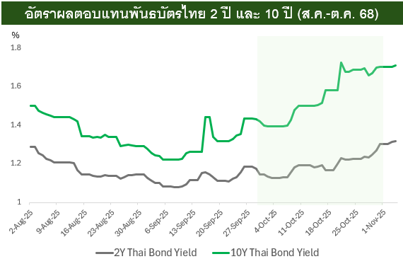 อัตราผลตอบแทนพันธบัตรไทย (Thai Bond Yield) เริ่มผันผวนมากขึ้นและเร่งตัวนับตั้งแต่เดือนก.ย.เป็นต้นมา ในเดือนต.ค. อัตราผลตอบแทนพันธบัตรไทยเร่งตัวในทุกช่วงอายุ อัตราผลตอบแทนพันธบัตรไทยอายุ 2 ปี เร่งตัวจาก 1.15% มาอยู่ที่ 1.3% ในสิ้นเดือนต.ค. และ อัตราผลตอบแทนพันธบัตรไทยอายุ 10 ปี เร่งตัวจาก 1.29% มาอยู่ที่ 1.70% ในสิ้นเดือนต.ค.