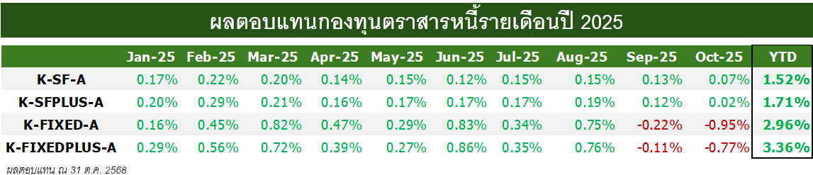 จากอัตราผลตอบแทนพันธบัตร (Bond Yield) ที่เร่งตัวขึ้น โดยเฉพาะในพันธบัตรระยะยาวของไทย ส่งผลให้กองทุนตราสารหนี้ระยะกลาง-ยาว อย่าง K-FIXED-A และ K-FIXEDPLUS-A ทำผลตอบแทนติดลบต่อเนื่องจากเดือนก.ย. โดยในเดือนต.ค. K-FIXED-A -0.95% และ K-FIXEDPLUS-A -0.77% สำหรับกองทุนตราสารหนี้ระยะสั้นยังคงมีผลตอบแทนเป็นบวกต่อเนื่องตลอดทั้งปี K-SF-A +0.07% และ K-SFPLUS-A +0.02%