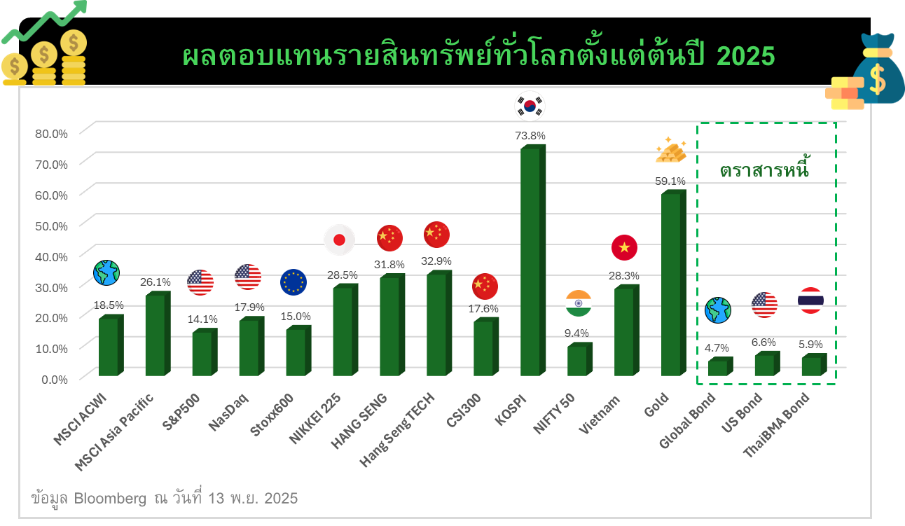 ปี 2025 ถือว่าเป็นปีที่ผลตอบแทนของหลายสินทรัพย์ไม่ได้เหวี่ยงแรงแบบปีที่แล้ว แต่ก็ยังมีเรื่องให้ลุ้นกันตลอด โดยสินทรัพย์ที่มาแรงเข้าเส้นชัยม้วนเดียวจบ หุ้นเกาหลี และทองคำ โดยมีหุ้นจีนและญี่ปุ่นตามมาติดๆ แต่ก็มีเหนื่อยบ้าง ส่วนตลาดหุ้นพี่ใหญ่อย่างสหรัฐฯ ก็มาแบบนิ่งๆ