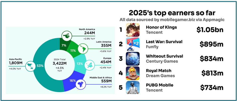 ดูจากภาพด้านล่างจะเห็นเลยว่าตลาดเกมในเอเชียมีผู้เล่นมากกว่าสหรัฐและยุโรป รวมกันเสียอีก แล้วมีผู้เล่นเยอะไม่พอ บริษัทผลิตเกมตัวเอ้ในเอเชียอย่าง Tencent Games ก็พัฒนาเกมติดตลาดถึงขั้นโกยรายได้มากที่สุดติด Top 5 ในช่วงครึ่งแรกของปี 2025 ถึง 2 เกม เลยทีเดียว