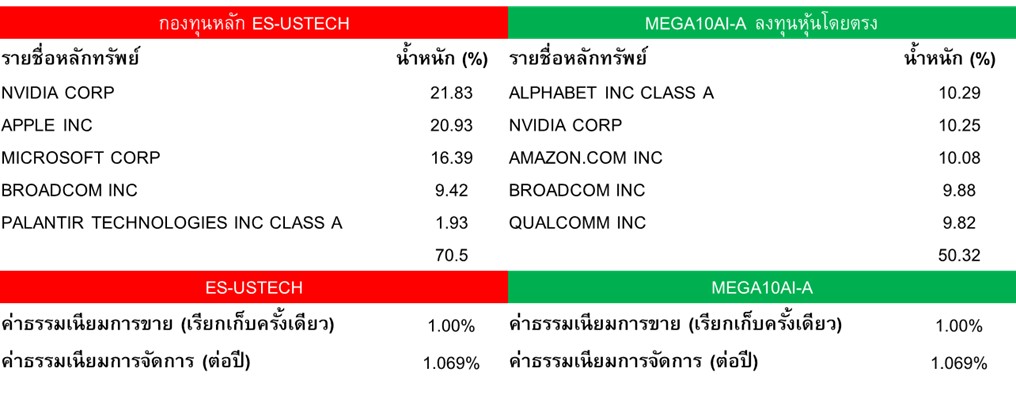 รู้หรือไม่ MEGA10AI-A ที่มี Nvidia เยอะแล้ว แต่ยังมีกองทุนเทคโนโลยีที่ลงทุนในหุ้น Nvidia มากกว่า คือ ES-USTECH จาก บลจ.อีสท์สปริง ประเทศไทย ลงทุนผ่านกองทุนหลัก iShares S&P 500 Information Technology Sector UCITS ETF อ้างอิงข้อมูล ณ วันที่ 25 พ.ย. 2568 กองทุนนี้มีสัดส่วน Nvidia มากถึง 21.83% ตามด้วย Apple 20.93% และ Microsoft ที่ 16.39% รวมกัน 3 ตัวเกือบ 60% และที่สำคัญไม่มี หุ้น Alphabet เลยเนื่องจากถูกจัดอยู่ในกลุ่ม Communication Services เรียกได้ว่าแทงสวนกระแส Google ในช่วงที่ผ่านมาจริงๆ