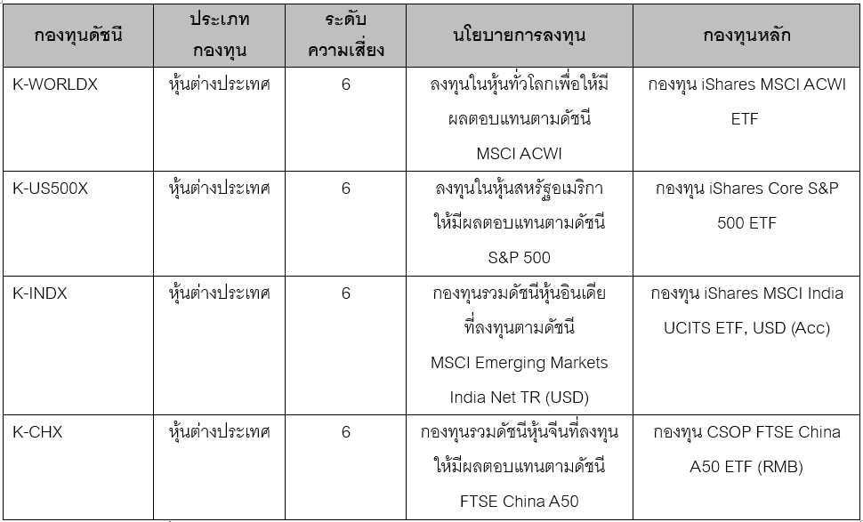 - K-WORLDX, K-WORLDXRMF, K-US500X, K-US500XRMF, K-INDX, K-CHX: ความเสี่ยงกองทุนระดับ 6