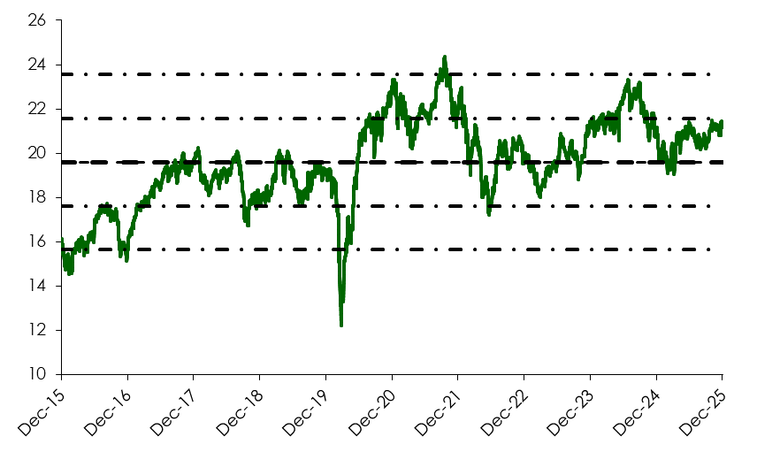 ตัดภาพมาที่ฝั่งตลาดหุ้นกันบ้าง เมื่อดูระดับมูลค่าจาก Forward P/E ก็ลดความตึงตัวลงมาที่ระดับประมาณ +1 SD และต่ำกว่าระดับสูงสุดที่ 2 SD ซึ่งเคยไปแตะเมื่อกลางปี 2024 สะท้อนว่าตลาดหุ้นอินเดียมียังมี Upside เหลือสำหรับปัจจัยบวกที่จะเข้ามา