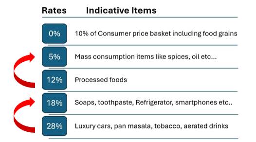 จากภาพด้านบนจะเห็นว่า รัฐบาลตัดสินใจปรับลดอัตรา Goods and Services Tax (GST) โดยนำสินค้าที่ถูกเก็บภาษีที่ 28% ไปรวมกับสินค้าในขั้นภาษี 18% และรวมสินค้าในขั้นภาษี 12% ไปรวมกับขั้นภาษี 5% ส่งผลให้ภาพรวมอัตราภาษีหรือ Effective tax rate ลดลง แน่นอนว่าจะช่วยกระตุ้นการใช้จ่ายสินค้าทั้งสินค้าจำเป็นในขั้นภาษีเดิมที่ 12% และสินค้าฟุ่มเฟือยในขั้นภาษีเดิมที่ 28%