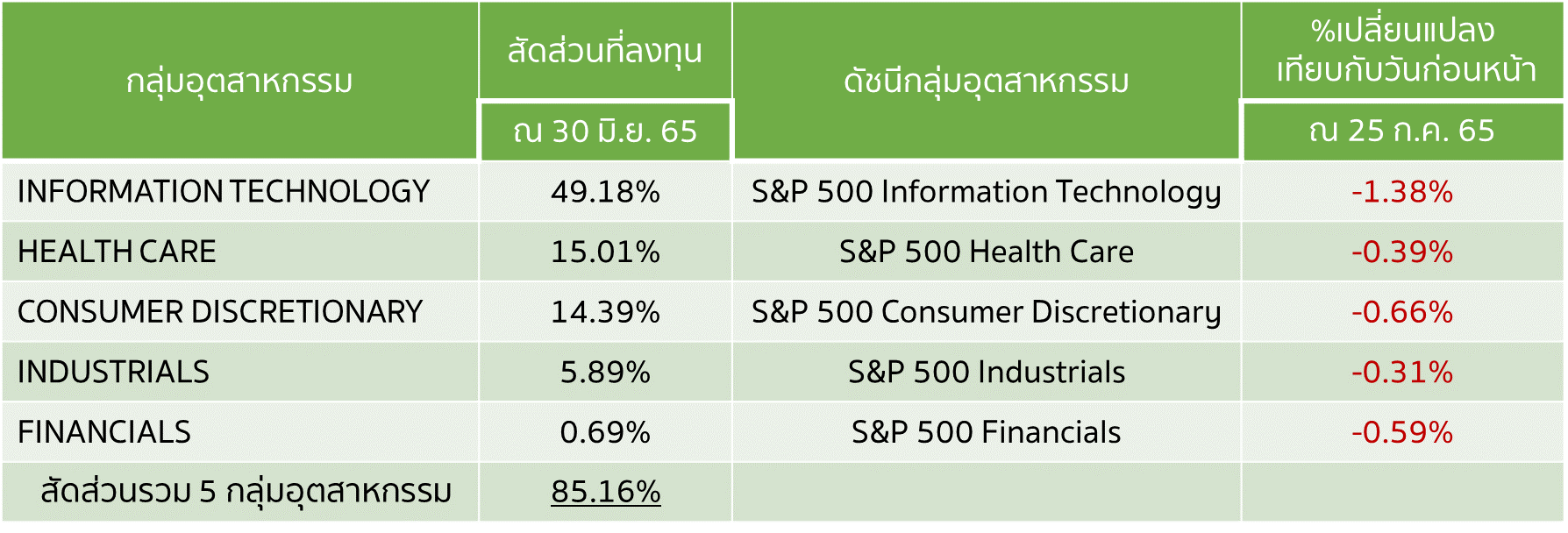 หากพิจารณากลุ่มอุตสาหกรรมที่กองทุนหลักของ K-USA ลงทุนอยู่ (ข้อมูล ณ 30 มิ.ย. 65) พบว่าดัชนีกลุ่มอุตสาหกรรมส่วนใหญ่มีการปรับตัวลดลง ดังนี้