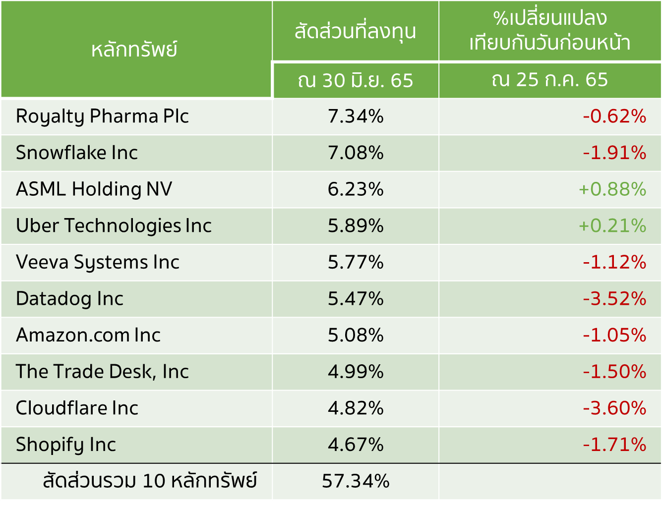 และหากพิจารณาหุ้น 10 อันดับแรก ที่กองทุนหลักของ K-USA ลงทุนมากที่สุด ณ 30 มิ.ย. 65 คิดเป็นสัดส่วนรวม 57.34% ของมูลค่ากองทุน พบว่า ส่วนใหญ่ราคาปรับตัวลง โดยมีรายละเอียดตามตารางด้านล่าง