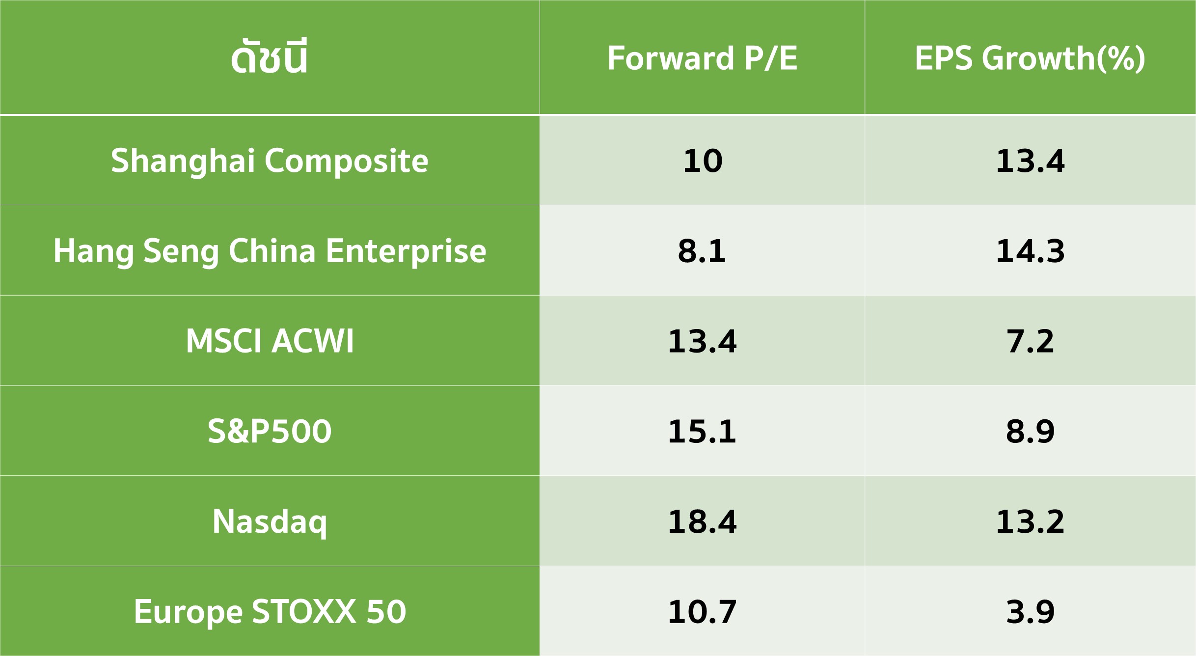 จากการที่จีนได้รับปัจจัยกดดันตลาดหุ้นมาตลอด 1 ปีเต็ม และปรับตัวลงมาต่อเนื่องก่อนฝั่งตลาดหุ้นประเทศพัฒนาแล้ว ยิ่งทำให้ Valuation ของตลาดหุ้นจีนต่ำกว่าประเทศอื่นๆ ในขณะที่คาดการณ์กำไรเติบโตโดดเด่นกว่าตลาดหุ้นอื่นๆ