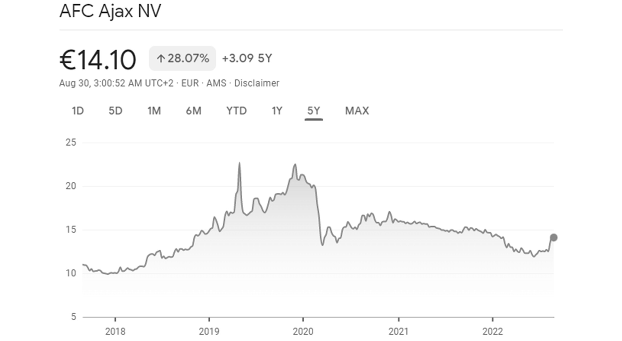 หุ้น AFC Ajax NV หรือสโมสรอาแจ๊กซ์ อัมสเตอร์ดัม ที่ซื้อขายในตลาดหลักทรัพย์ฯ Euronext Amsterdam มีราคาตลาดต่ำสุด-สูงสุดในรอบ 5 ปี (ณ วันที่ 30 ส.ค. 65) ระหว่าง 9.96-20.70 Euro per share มูลค่าตลาด (Market Cap.) 258.50 Million Euro ไม่ระบุอัตราผลตอบแทนจากเงินปันผล (ปีล่าสุด) ราคาปิดล่าสุด (ณ วันที่ 30 ส.ค. 65) 14.10 Euro per share ทำกำไรได้ 4 ใน 5 ปีหลังสุด โดยปีล่าสุดขาดทุน 6.44% เทียบกับรายได้ทั้งหมด