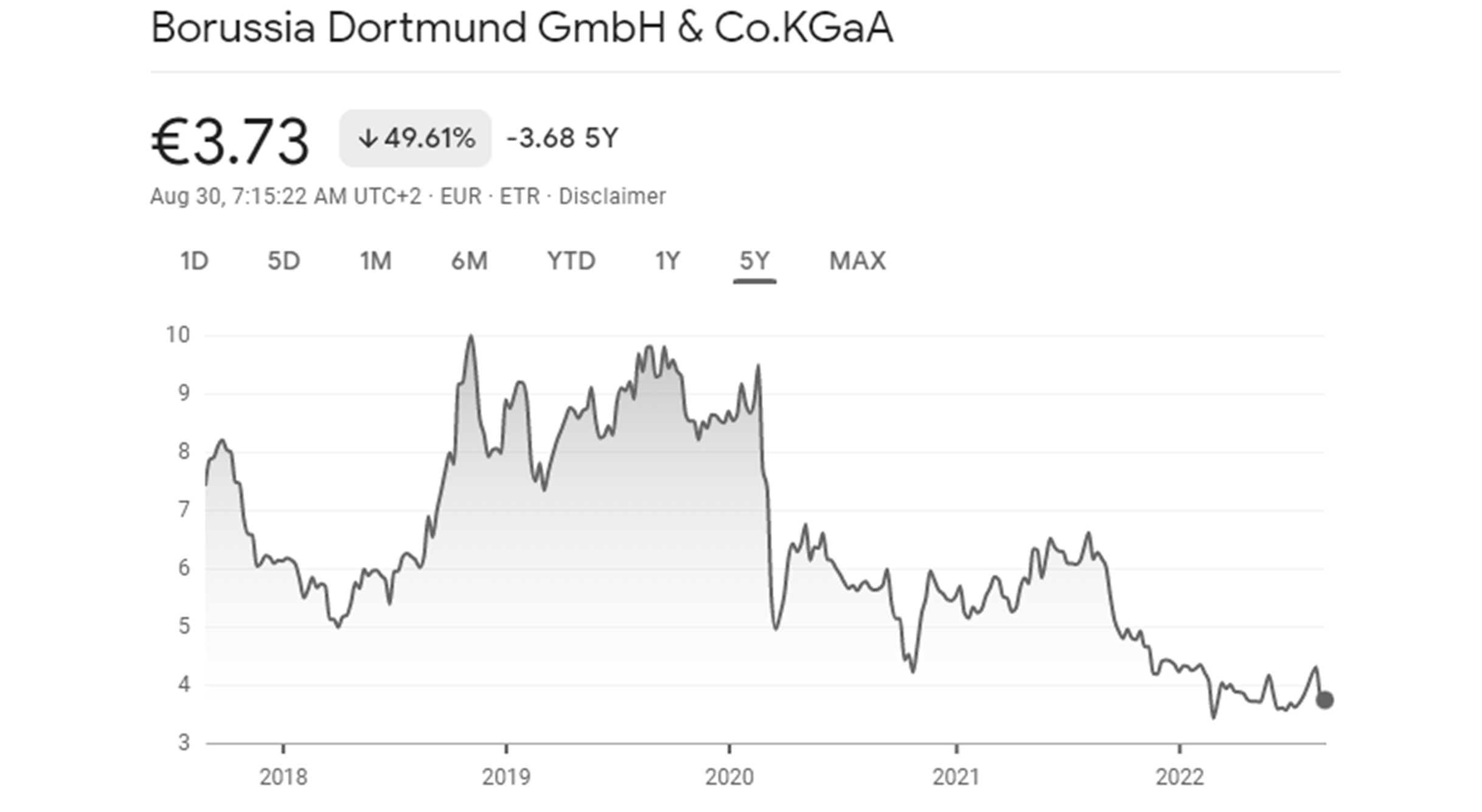 หุ้น Borussia Dortmund หรือสโมสรโบรุสเซีย ดอร์ทมุนด์ที่ซื้อขายในตลาดหลักทรัพย์ฯ ในเยอรมัน มีราคาตลาดต่ำสุด-สูงสุดในรอบ 5 ปี (ณ วันที่ 30 ส.ค. 65) ระหว่าง 3.42-9.99 Euro per share มูลค่าตลาด (Market Cap.) 412.22 Million Euro ไม่ระบุอัตราผลตอบแทนจากเงินปันผล (ปีล่าสุด) ราคาปิดล่าสุด (ณ วันที่ 30 ส.ค. 65) 3.73 Euro per share ทำกำไรได้ 3 ใน 5 ปีหลังสุด โดยปีล่าสุดขาดทุน 20.83% เทียบกับรายได้ทั้งหมด