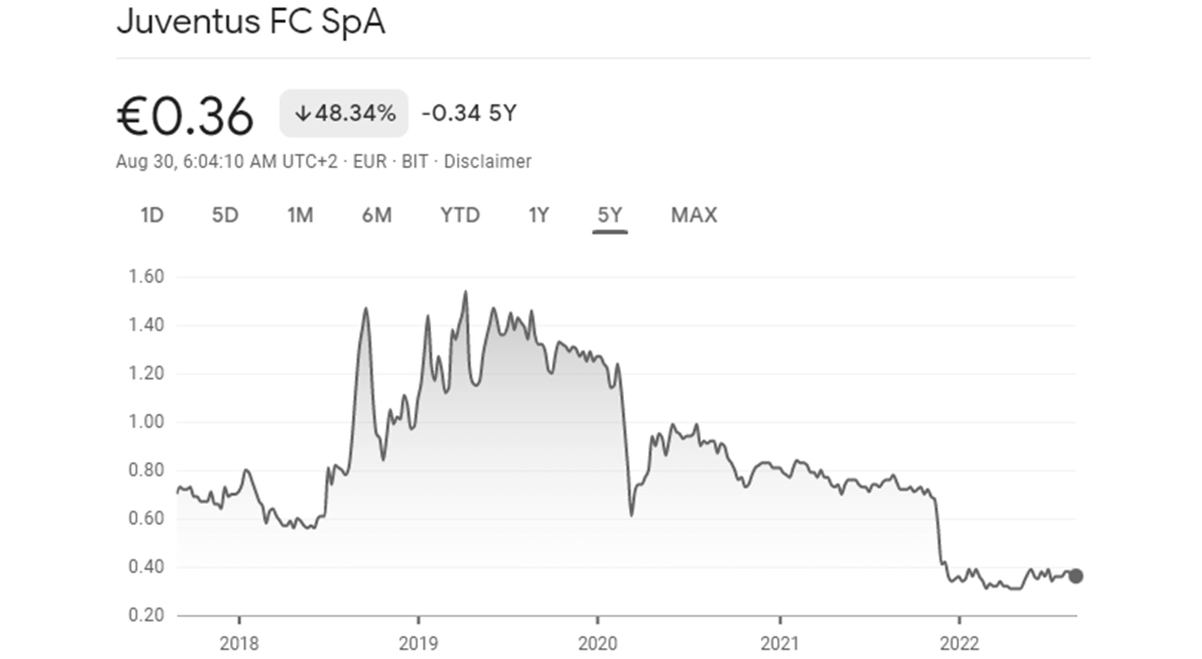 หุ้น Juventus FC Spa หรือสโมสรยูเวนตุส ที่ซื้อขายในตลาดหลักทรัพย์ฯ ในอิตาลี มีราคาตลาดต่ำสุด-สูงสุดในรอบ 5 ปี (ณ วันที่ 30 ส.ค. 65) ระหว่าง 0.31-1.54 Euro per share มูลค่าตลาด (Market Cap.) 901.24 Million Euro ไม่ระบุอัตราผลตอบแทนจากเงินปันผล (ปีล่าสุด) ราคาปิดล่าสุด (ณ วันที่ 30 ส.ค. 65) 0.36 Euro per share ทำกำไรได้ 1 ใน 5 ปีหลังสุด โดยปีล่าสุดขาดทุน 51.31% เทียบกับรายได้ทั้งหมด