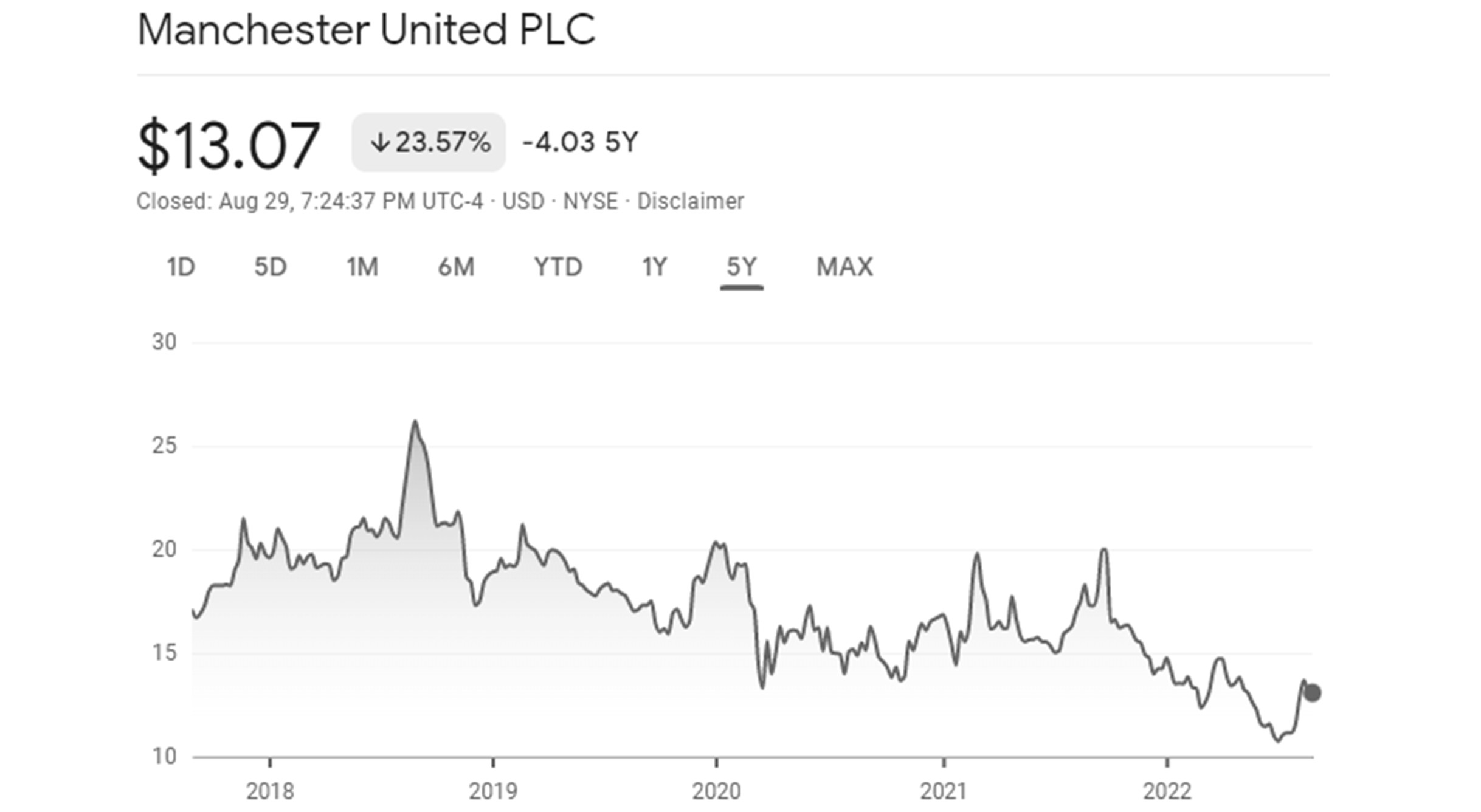 หุ้น MANU หรือสโมสรแมนยู ที่ซื้อขายในตลาดหลักทรัพย์ฯ NYSE มีราคาตลาดต่ำสุด-สูงสุดในรอบ 5 ปี (ณ วันที่ 30 ส.ค. 65) ระหว่าง 10.73-26.20 USD per share มูลค่าตลาด (Market Cap.) 2.13 Billion USD มีอัตราผลตอบแทนจากเงินปันผล (ปีล่าสุด) 1.38% ราคาปิดล่าสุด (ณ วันที่ 30 ส.ค. 65) 13.25 USD per share ทำกำไรได้ 2 ใน 5 ปีหลังสุด