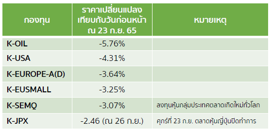 23 ก.ย. 65 หลายกองทุนราคาปรับตัวลง (ประกาศคืน 26 ก.ย.) โดยราคากองทุนหุ้นสหรัฐฯและกองทุนหุ้นยุโรป ปรับตัวลงสอดคล้องกับตลาดหุ้น ณ 23 ก.ย. อย่างตลาดหุ้นสหรัฐฯ เช่น ดัชนี Dow Jones -1.62% S&P500 -1.72% และ Nasdaq -1.80% ส่วนตลาดหุ้นยุโรป เช่น ดัชนี STOXX 50 (หุ้นใหญ่) -2.29% และ STOXX 600 (หุ้นใหญ่/กลาง/เล็ก) -2.34%เทียบกับวันก่อนหน้า
