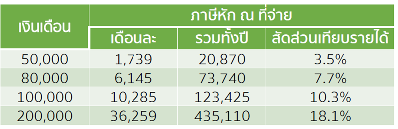 * สมมติฐาน พนักงานมีรายได้เฉพาะเงินเดือน ลดหย่อนส่วนตัว 60,000 บาท และเงินสมทบประกันสังคม 6,300 บาท (อัตราสูงสุดปี 2565)