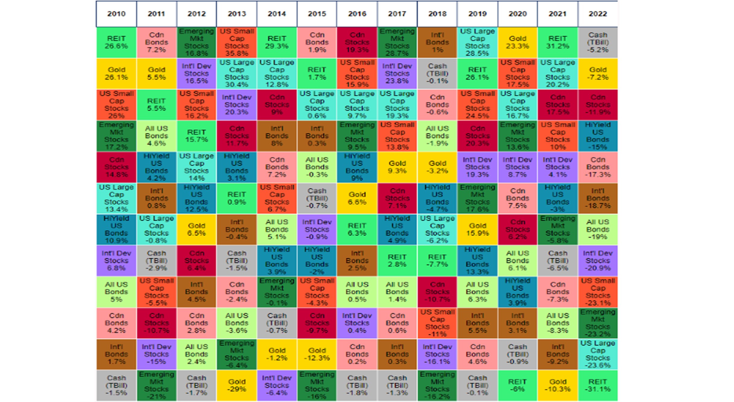 รูป1*: เปรียบเทียบผลตอบแทนรายปีปฏิทินตามประเภทสินทรัพย์ (Asset Class) ตั้งแต่ปี 2010-2022