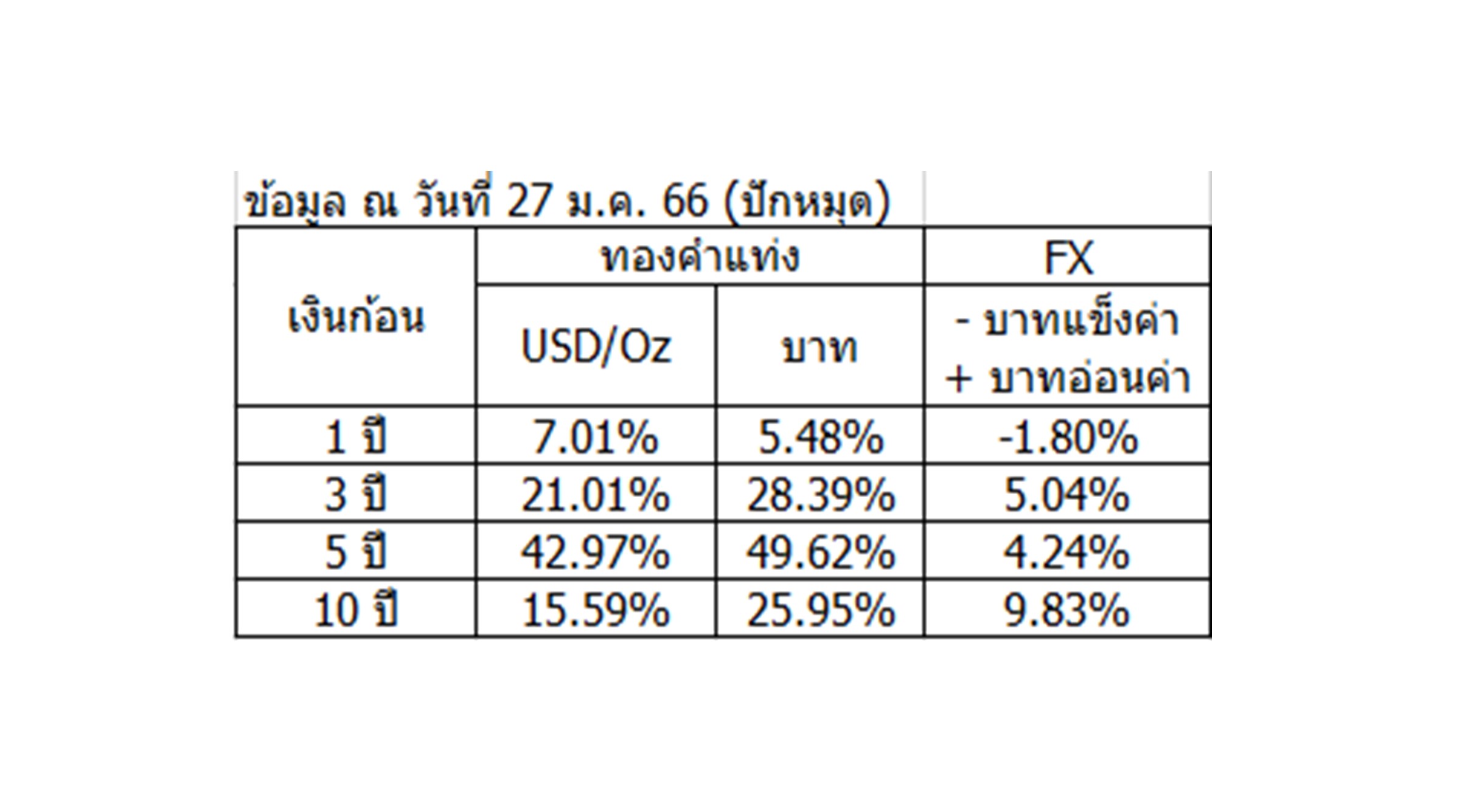จากตารางแสดงผลตอบแทนย้อนหลังของทองคำแท่งอ้างอิงสกุลเงินดอลลาร์สหรัฐฯ ส่วนใหญ่จะมีความบริสุทธิ์ 99.99% ส่วนทองคำอ้างอิงสกุลเงินบาท ความบริสุทธิ์อยู่ที่ 96.5% และปัจจัยหนึ่งที่ทำให้ผลตอบแทนของทองคำแท่ง 2 สกุลเงินมีผลตอบแทนไม่เท่ากัน มาจาก อัตราแลกเปลี่ยนเงินสกุลดอลลาร์สหรัฐฯกับเงินบาท โดยจะพบว่า การลงทุนในทองคำกับร้านทอง เป็นเงินก้อน จะให้ผลตอบแทนดีกว่า ทองคำแท่งในสกุลเงินดอลลาร์สหรัฐฯ ก็เมื่อเงินบาทอ่อนค่าเมื่อเทียบกับดอลลาร์สหรัฐฯ นอกจากนี้ จากผลตอบแทนย้อนหลัง จะพบว่า การถือครองทองคำระยะยาว ไม่ได้แปลว่าจะให้ผลตอบแทนดีเสมอ เห็นได้จาก ลงทุนเป็นเงินก้อน 10 ปี จะได้ผลตอบแทนน้อยกว่า ลงทุนเป็นเงินก้อน 5 ปี
