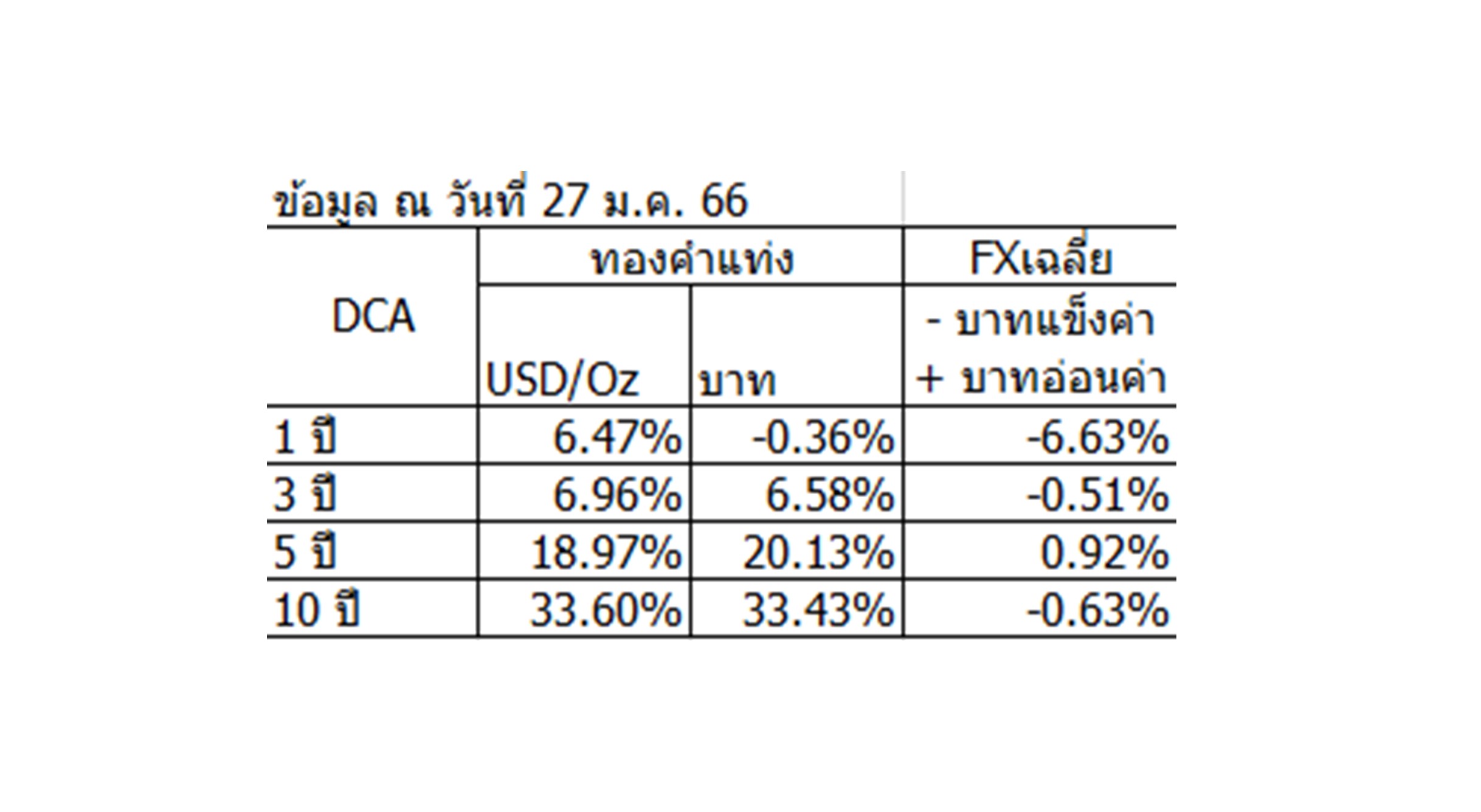 จากตารางเป็นแสดงผลตอบแทนจากการทยอยออมรายเดือน Dollar Cost Averaging : DCA และลงทุนในทองคำแท่งเช่นเดียวกัน มีลักษณะผลตอบแทนไปในทิศทางเดียวกัน โดยอิงกับอัตราแลกเปลี่ยนระหว่างเงินบาทกับดอลลาร์สหรัฐฯ โดยผลตอบแทนจะได้ไม่มากเท่ากับการลงทุนเป็นเงินก้อน และทองคำแท่งตามร้านทอง (ซื้อขายเป็นเงินบาท) จะให้ผลตอบแทนสูงกว่า เมื่อเงินบาทอ่อนค่าเทียบกับดอลลาร์สหรัฐฯ ในขณะที่ช่องทางในการทยอยออมทองคำในสกุลดอลลาร์สหรัฐ ก็เป็นอีกทางเลือกกับผู้ประกอบการร้านทอง ดังนั้น เลือกได้ว่าจะออมทองสกุลเงินบาท หรือสกุลเงินดอลลาร์สหรัฐฯ โดยต้องพิจารณาค่าเงินบาทเทียบดอลลาร์สหรัฐฯด้วย