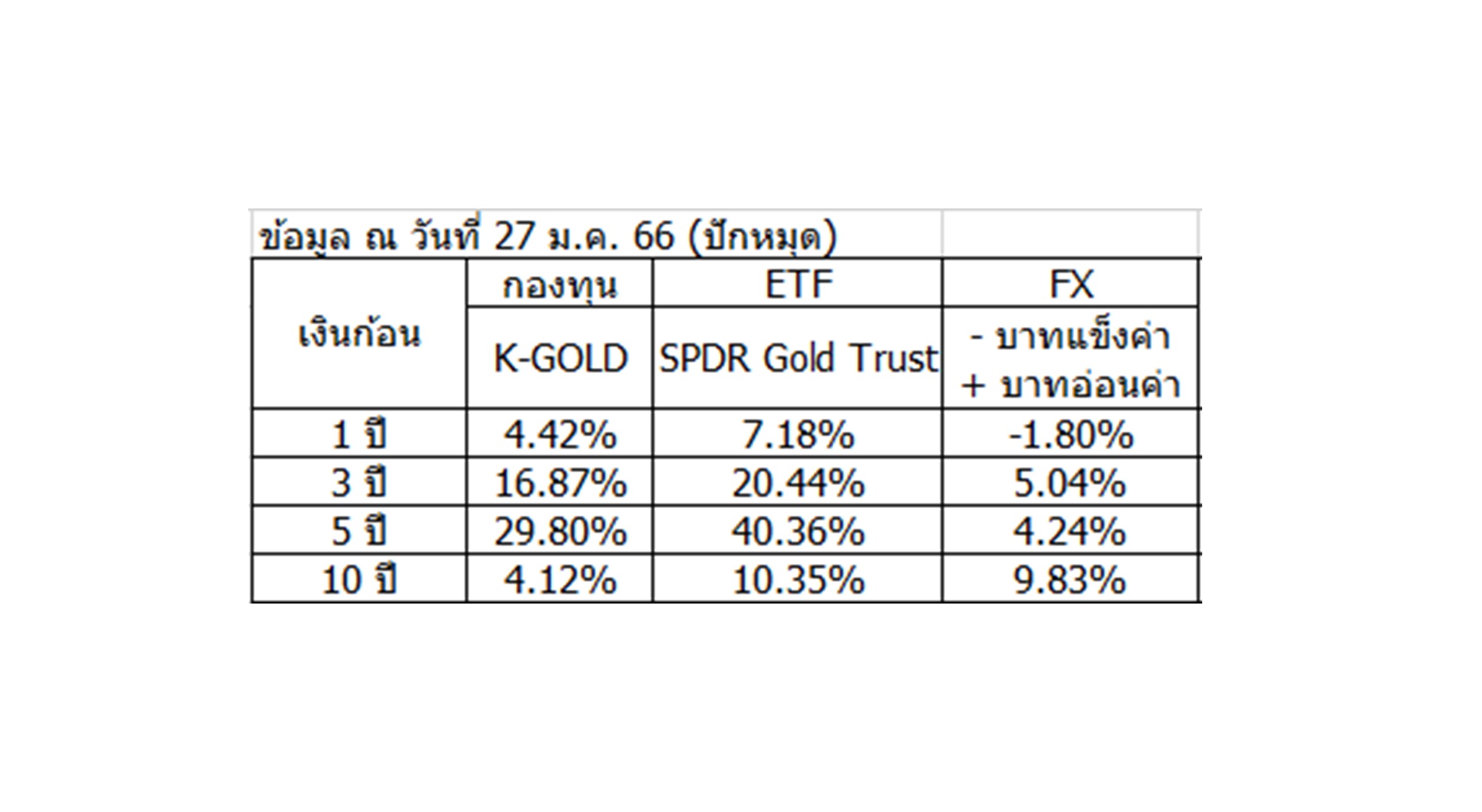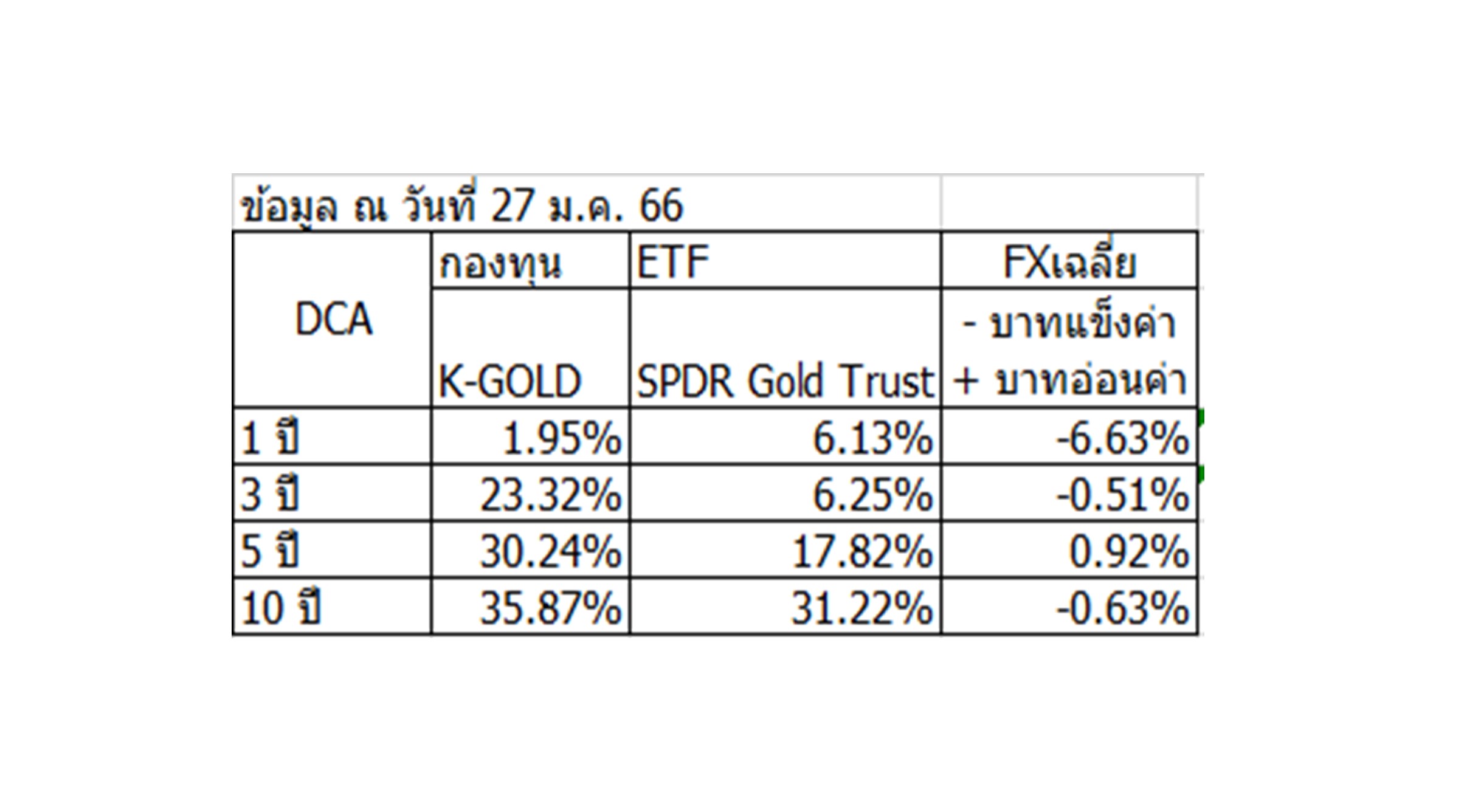จากตาราง (ด้านบน) เป็นผลตอบแทนย้อนหลังจากการลงทุนเป็นการออมรายเดือน (DCA) จะพบว่า ผลตอบแทนย้อนหลังทุกช่วงเวลาของกองทุน K-GOLD จะให้ผลตอบแทนดีกว่าเสมอ ไม่ว่าค่าเงินบาทเทียบกับดอลลาร์สหรัฐฯ จะอ่อนหรือแข็งค่า โดยส่วนหนึ่งมาจากต้นทุนที่ถูกลงจากการทยอยซื้อเป็นรายเดือน โดยกองทุนรวมทองคำ จะมีทางเลือกให้ได้ผลตอบแทนระหว่างทาง เช่น เงินปันผลจากกองทุนรวม และเลือกนโยบายการป้องกันอัตราแลกเปลี่ยน มีทั้งป้องกันอัตราแลกเปลี่ยน 100%, ป้องกันอัตราแลกเปลี่ยนบางส่วน, ไม่ป้องกันอัตราแลกเปลี่ยน ให้เลือก หากไม่ต้องกังวลเรื่องอัตราแลกเปลี่ยน แนะนำให้ป้องกันอัตราแลกเปลี่ยน 100% จะได้มองเรื่องส่วนต่างราคาเป็นหลัก