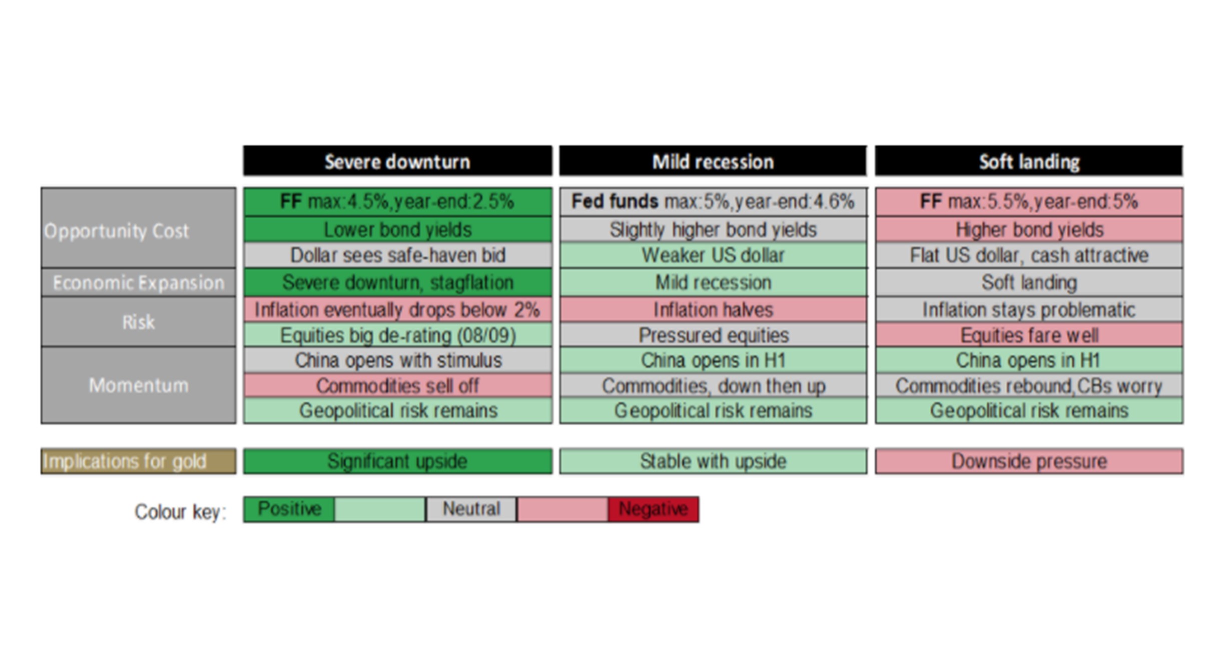 World Bank มีมุมมองต่อราคาทองคำ อยู่ในระดับ 1,850-1,900 USD/Oz โดยปัจจัยที่จะกระทบกับราคาทองคำ คือ โอกาสในการเกิดภาวะเศรษฐกิจถดถอยในสหรัฐฯ และยุโรป โดยกรณี Base Case คือ จะเกิด Mild Recession จะทำให้ราคาทองคำทยอยปรับขึ้นได้ โดยคาดการณ์จาก www.gold.org คาดการณ์กรณี Base Case ว่า จะทำให้อัตราดอกเบี้ยนโยบายของธนาคารกลางสหรัฐ (FED Fund Rate) สูงสุด 5% ในช่วงกลางปี 2023 นี้ ซึ่งจะทำให้ค่าเงินดอลล่าร์สหรัฐฯอ่อนค่าลง อัตราเงินเฟ้ออยู่ในระดับกลาง (สูงกว่าอัตราเงินเฟ้อเป้าหมายที่ 2 %) จะทำให้ราคาสินค้าโภคภัณฑ์ ปรับตัวลดลงชั่วคราว แล้วปรับตัวเพิ่มขึ้นได้