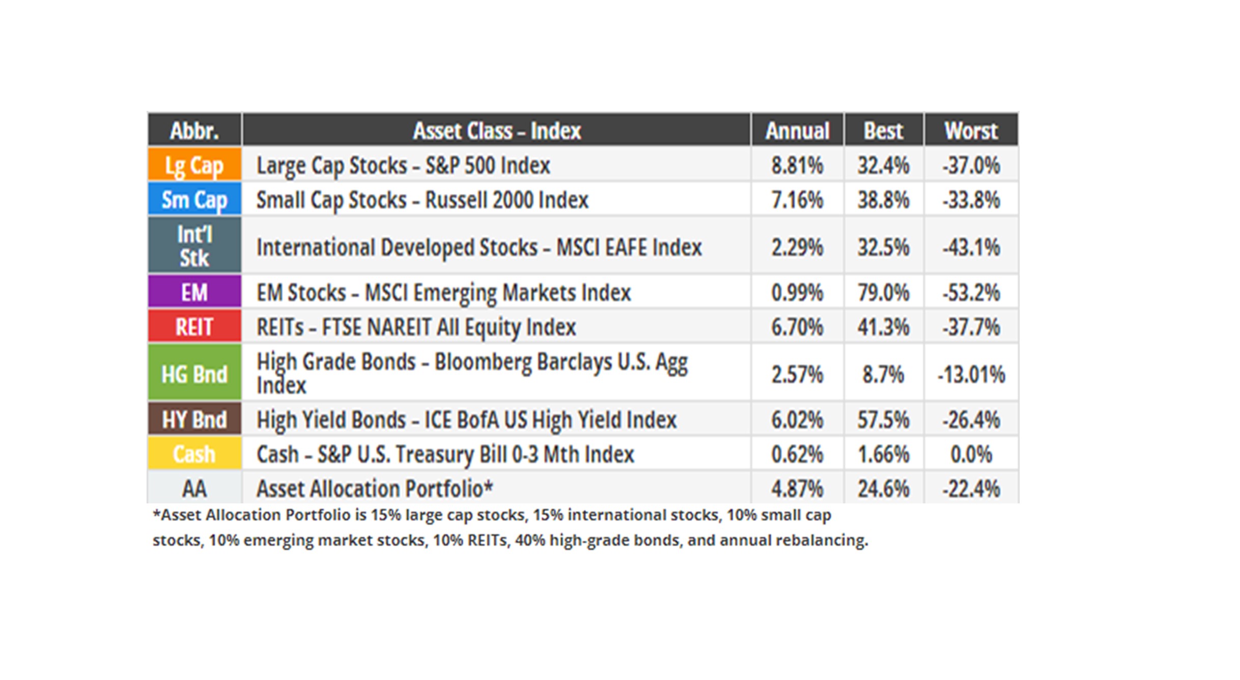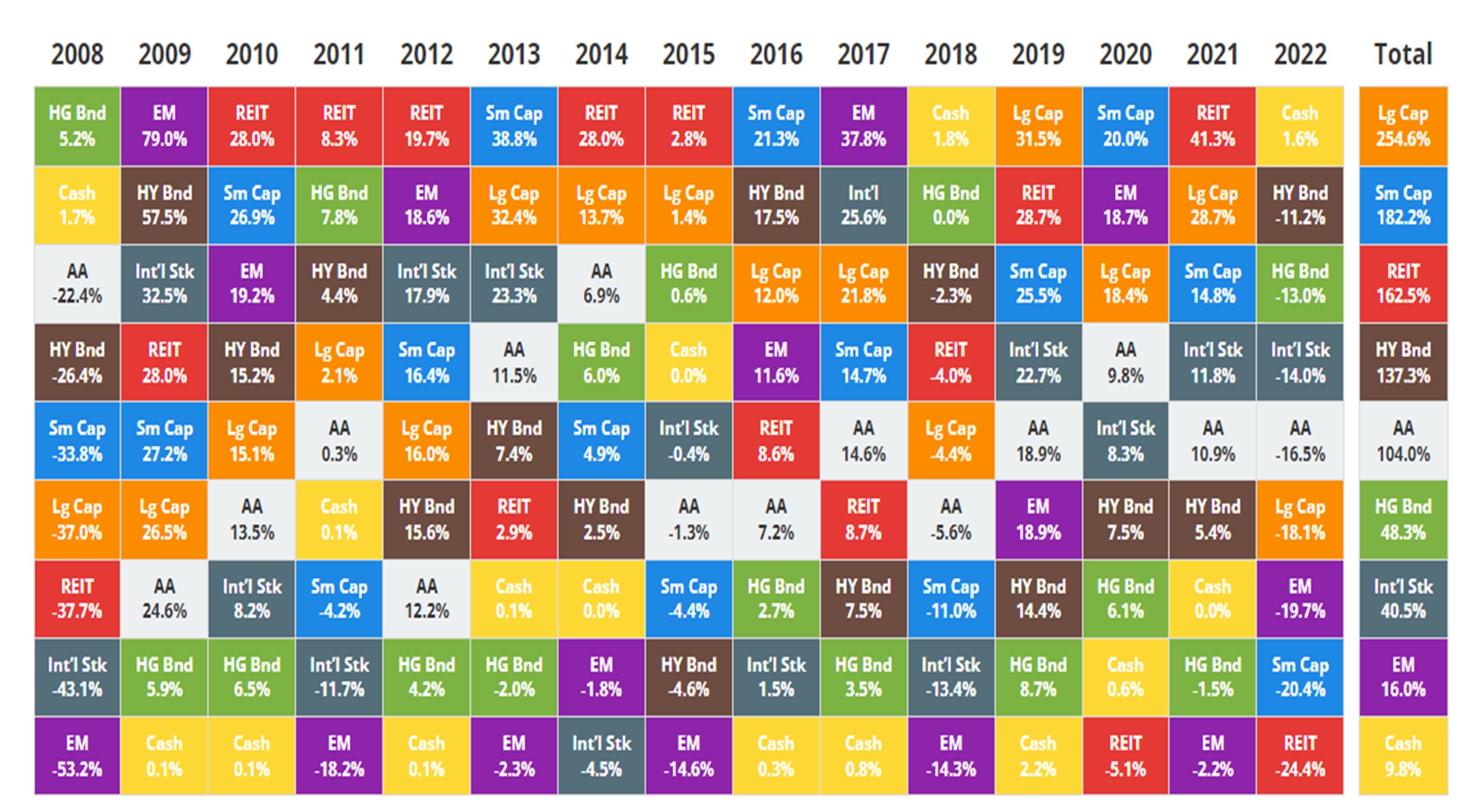 จากรูปที่ 1 เปรียบเทียบอัตราผลตอบแทนรายปีปฏิทินตั้งแต่ ปี 2008-2022 โดยเฉพาะปี 2022 จะพบว่า เป็นปีที่ทุกประเภทสินทรัพย์มีผลตอบแทนติดลบ มีเพียงเงินสดที่มีผลตอบแทนเป็นบวกเล็กน้อย แต่เมื่อมีการจัดสรรเงินลงทุน หรือ ที่เรียกว่า Asset Allocation (AA) ช่องสีเทา ว่าจะมีผลตอบแทนอยู่ในระดับกลางๆ ในแต่ละปีปฎิทิน สำหรับช่องขวาสุด เป็น Total Return ที่หากมีเงินลงทุน 1 ล้านบาท เริ่มต้นลงทุนตั้งแต่ปี 2008 ในหุ้นขนาดใหญ่ของสหรัฐฯ (S&P 500 Index) จะได้ผลตอบแทนรวมอยู่ที่ 254.6% ดังนั้น วิธีการจัดพอร์ตการลงทุน จึงเป็นเรื่องสำคัญ ในภาวะการลงทุนที่มีความผันผวนสูง