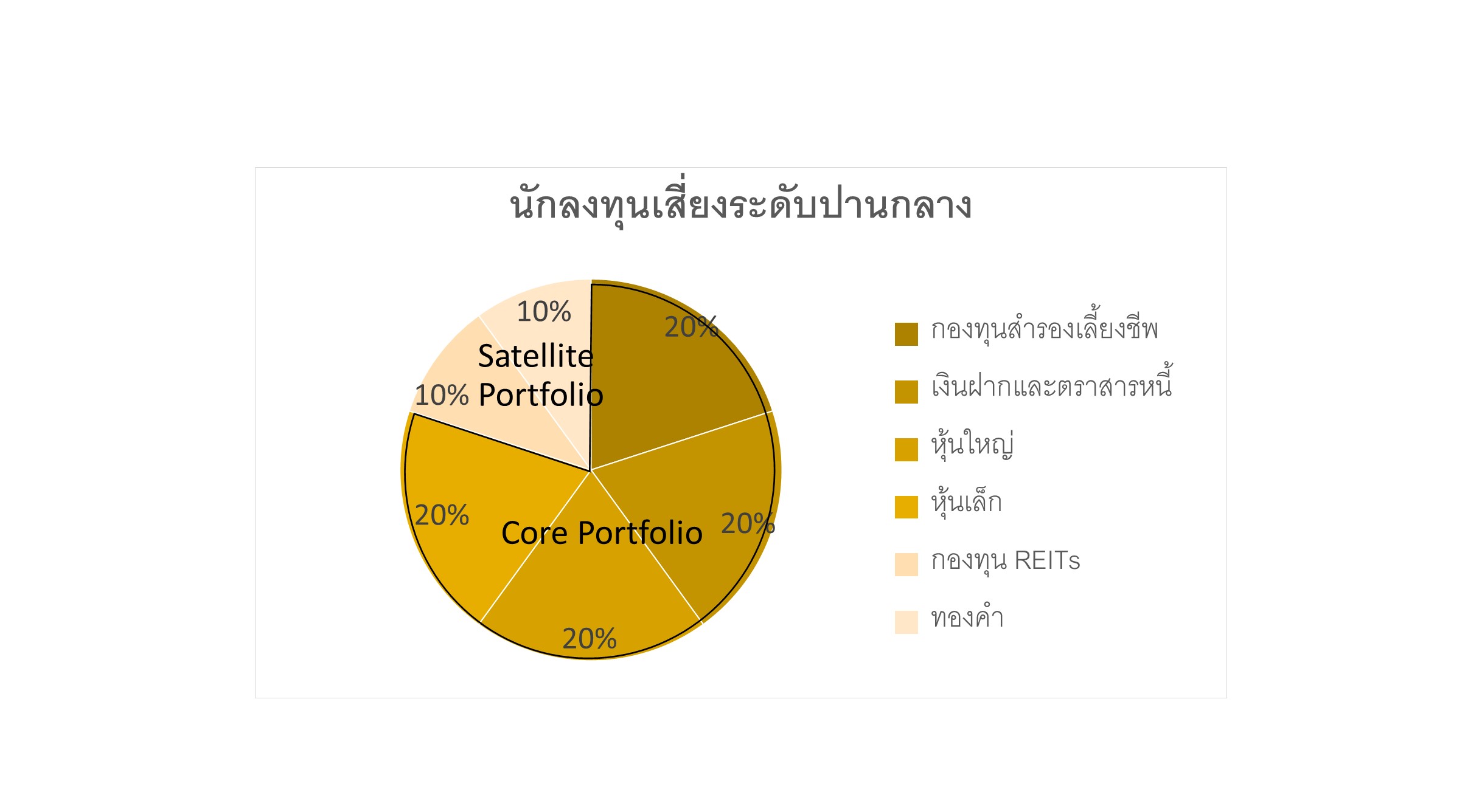 สำหรับนักลงทุนที่รับความเสี่ยงได้ปานกลาง จะใช้ กองทุนสำรองเลี้ยงชีพ (20%) เงินฝากและตราสารหนี้ (20%) หุ้นใหญ่ (20%) และหุ้นเล็ก (20%) เป็น Core Port ส่วนอีก 20% เป็นส่วนที่เหลือ เช่น กองทุน REITs ทองคำ กองทุนหุ้นต่างประเทศ
