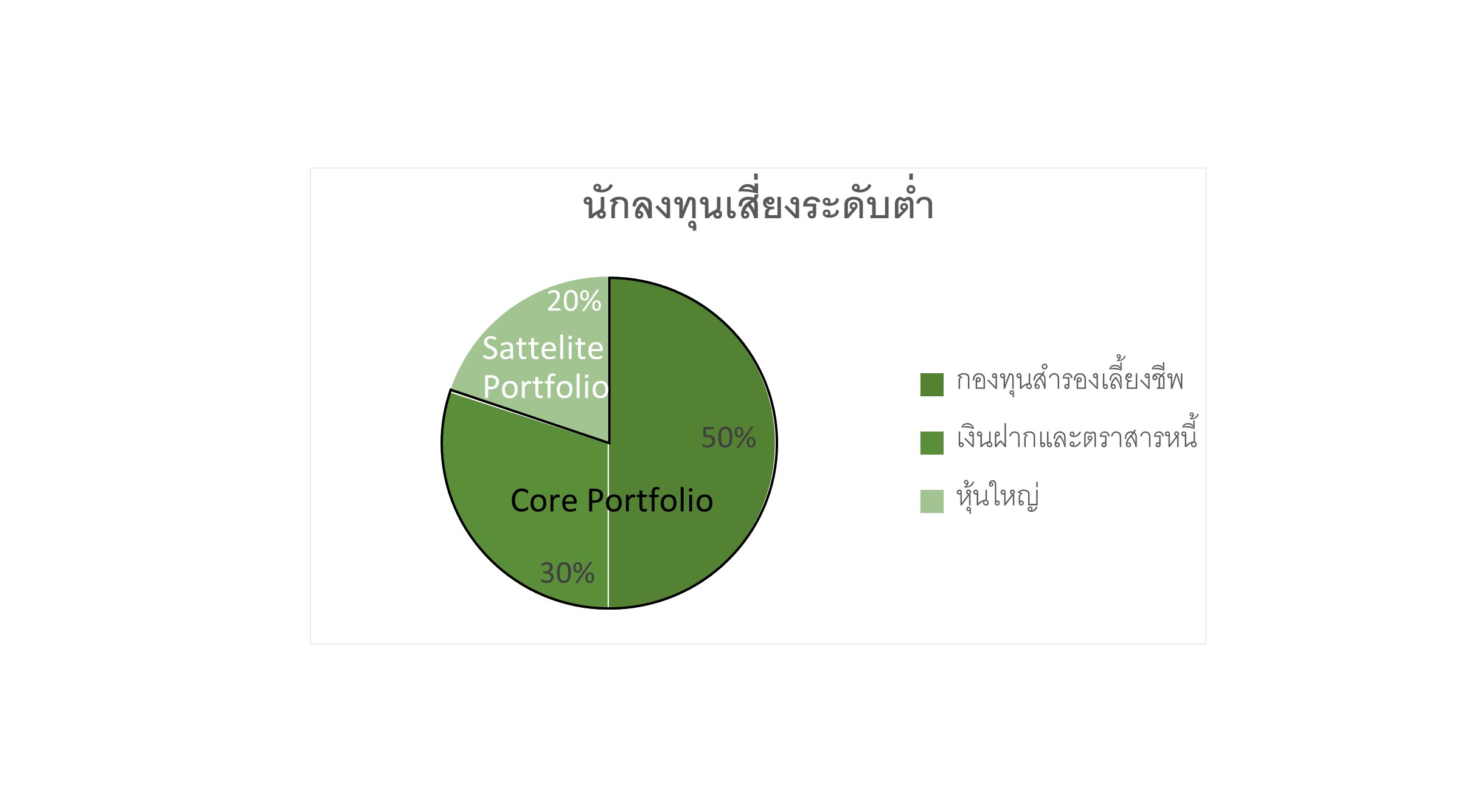 สำหรับนักลงทุนที่รับความเสี่ยงต่ำ จะใช้ กองทุนสำรองเลี้ยงชีพ เงินฝากและตราสารหนี้ สัดส่วน 80% ของเงินลงทุนทั้งหมด เป็น Core Port และ ใช้การผสมของหุ้นใหญ่ทั้งแบบ Active และ Passive สัดส่วน 20% เป็น Satellite Port