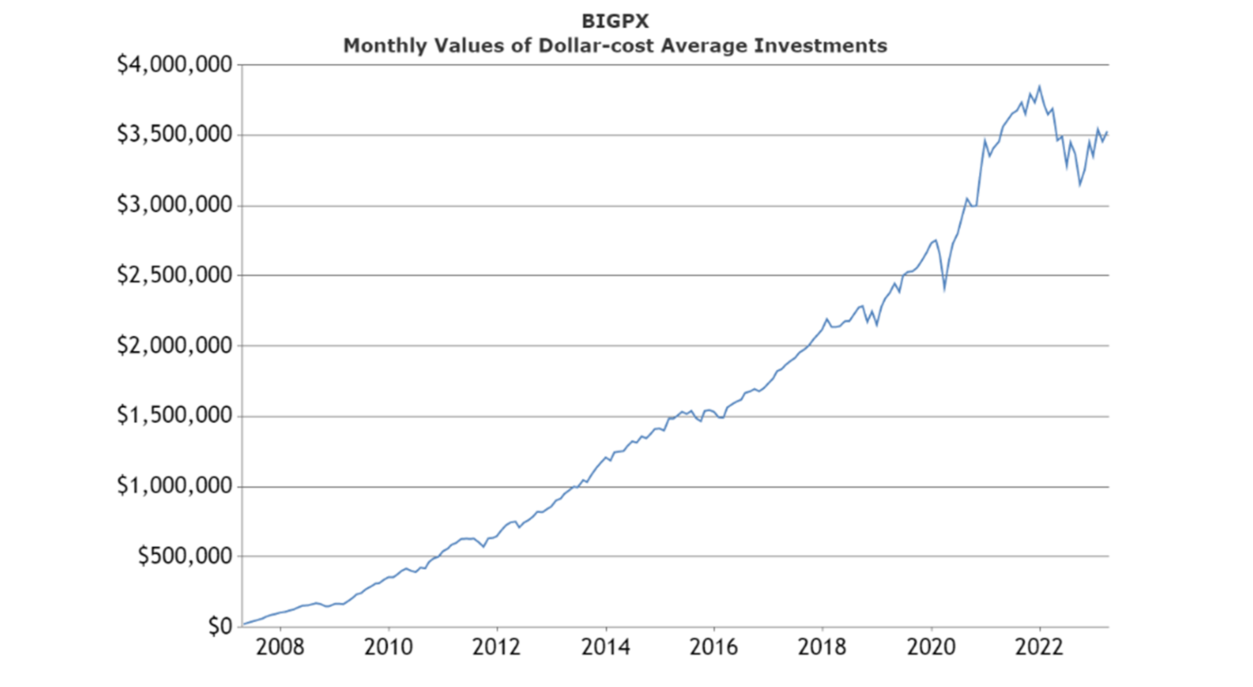 จากข้อมูลจะเห็นว่าถ้าเราลงทุนเป็นประจำทุกเดือน เดือนละ 10,000 บาท ระยะเวลาประมาณ 16 ปี เงินของเราจะเติบโตเป็นประมาณ 3.53 ล้านบาท ซึ่งต้องบอกว่าการ DCA ในครั้งนี้ผ่านทั้งวิกฤติตลาดหุ้นลงแรงๆ อย่าง Subprime ปี 2008 สงครามการค้าระหว่างจีนและสหรัฐฯปี 2018 และครั้งล่าสุดคือ COVID-19 ปี 2020 ที่กดตลาดหุ้นลงแรงทั่วโลกด้วยเช่นกัน ซึ่งพิสูจน์แล้วว่าการ DCA แม้จะเผชิญกับวิกฤติเศรษฐกิจ วิกฤติตลาดการลงทุนต่างๆ ก็สามารถผ่านพ้น และพาเราไปสู่เป้าหมายการลงทุนได้ เพียงแค่เราลงทุนกระจายความเสี่ยงแม้จะขาดทุน แต่ก็จะขาดทุนไม่เยอะเท่าลงทุนหุ้นอย่างเดียว พยายามลงทุนอย่างต่อเนื่องสม่ำเสมอเพราะเมื่อตลาดลงแรงๆ นั่นเป็นจังหวะที่เราจะได้ซื้อของถูก ถัวเฉลี่ยต้นทุนของเราให้ต่ำลงไปอีก รวมถึงอดทนรอเวลาแม้จะติดลบ เพราะอดีตสอนเรามาเสมอว่า