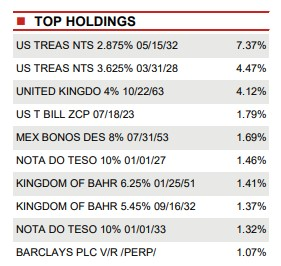 กองทุนเน้นลงทุนในตราสารหนี้ทั่วโลก โดยลงทุนในหน่วยลงทุนของกองทุน Nomura Funds Ireland – Global Dynamic Bond Fund, Class I USD (กองทุนหลัก) 102.06% เงินฝาก 2.20% และอื่นๆ -4.26% (ข้อมูล ณ วันที่ 30 มิ.ย. 66) ทั้งนี้ ทรัพย์สิน 10 อันดับแรกที่กองทุนหลักลงทุน ณ วันที่ 30 มิ.ย. 66 ได้แก่