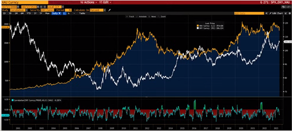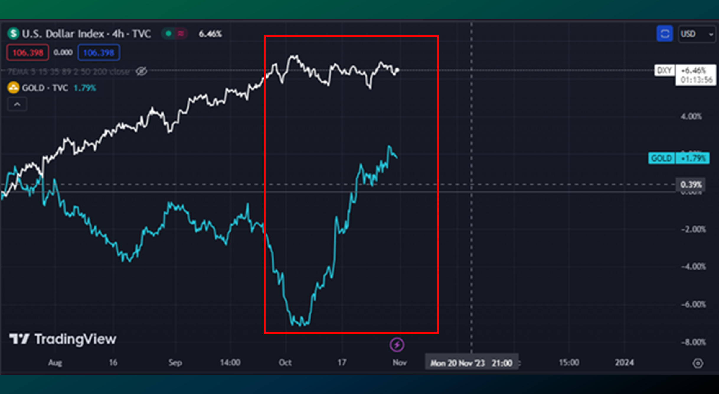ในอดีตทองคำมักมีทิศทางการเคลื่อนไหวตรงกันข้าม กับค่าเงินดอลลาร์สหรัฐฯอย่างเห็นได้ชัด เมื่อค่าเงินดอลลาร์สหรัฐฯแข็งค่า ราคาทองคำก็จะปรับตัวลง แต่เมื่อค่าเงินดอลลาร์สหรัฐฯอ่อนค่า ราคาทองคำก็จะปรับตัวขึ้น ซึ่งหากดูข้อมูลในปัจจุบัน จะพบว่าช่วงตั้งแต่เดือน ก.ค. 66 เงินดอลลาร์สหรัฐฯปรับตัวแข็งค่าขึ้นอย่างต่อเนื่อง ตามทิศทาง Bond Yield สหรัฐฯที่ปรับตัวขึ้นจนถึงต้นเดือนต.ค. ความน่าสนใจของทองคำที่ไม่ได้สร้างผลตอบแทนระหว่างการถือจึงน่าสนใจน้อยกว่า การฝากเงิน การถือพันธบัตรที่ได้ดอกเบี้ยเพิ่มขึ้นเรื่อยๆ ทองจึงน่าสนใจน้อยกว่า และค่อยๆปรับตัวลง แต่เมื่อค่าเงินดอลลาร์ฯเริ่มพักตัวตั้งแต่ช่วงต้นเดือนต.ค. ตามการพักตัวของ Bond Yield สหรัฐฯ แรงซื้อราคาทองคำก็กลับมา ดันราคาทองคำให้ปรับตัวขึ้น