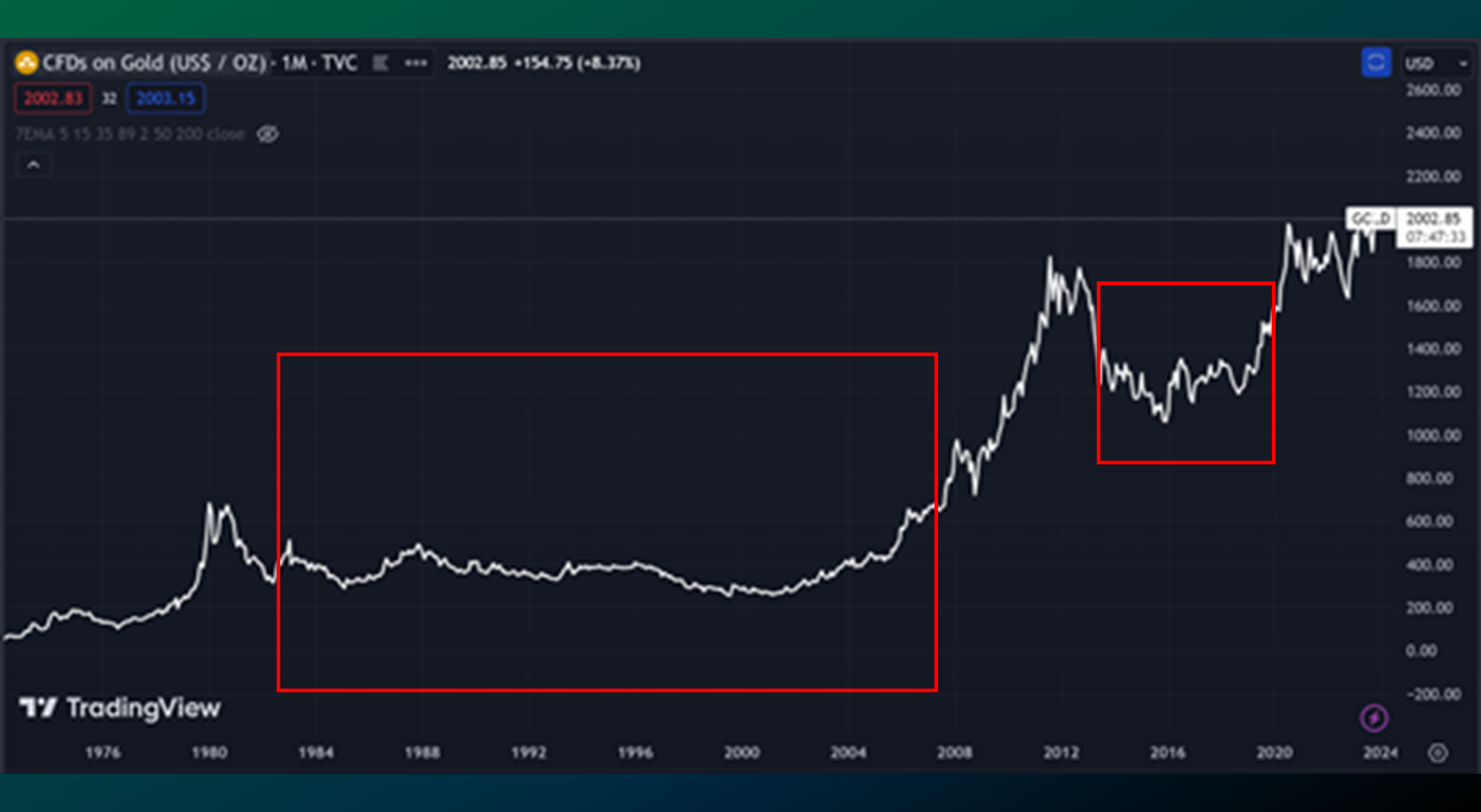 นักลงทุนหลายคนมีความเชื่อว่าลงทุนทองระยะยาวจะดี ซื้อๆเก็บไว้ เดี๋ยวราคาก็ขึ้นเองในอนาคต ซึ่งก็เป็นหนึ่งในความเชื่อที่มีมานานเพราะราคาทองในอดีต เทียบกับปัจจุบันก็มีการปรับตัวขึ้นมาต่อเนื่องจริงๆ แม้จะมีช่วงที่ราคาทองไม่สร้างผลตอบแทนเป็นเวลานานบ้าง เช่น 1980 – 2008 และปี 2012 - 2020
