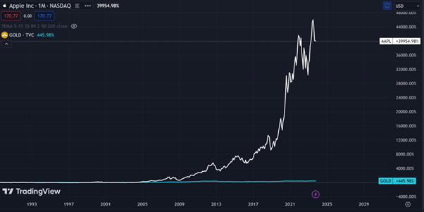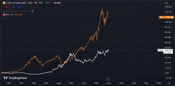 แต่ด้วยระยะเวลาการลงทุนที่เท่ากันในระยะยาว หากลงทุนสินทรัพย์อย่างอื่นควบคู่ไปด้วย เช่น หุ้น อย่างในตัวอย่างลงทุนดัชนี S&P 500 ตั้งแต่ ต.ค. 32 จนถึงปัจจุบันช่วงเดือนต.ค. 66 เทียบกับการลงทุนทองคำ จะพบว่าการลงทุนดัชนีหุ้น S&P 500 ทำผลตอบแทนอยู่ที่ 1093% ชนะการลงทุนทองคำที่ผลตอบแทน 446% และหากลงทุนหุ้นที่มีการเติบโตอย่างก้าวกระโดดตั้งแต่ในอดีต เช่น APPLE, AMAZON หรือหุ้นอีกหลายๆตัว ก็มีโอกาสได้รับผลตอบแทนมหาศาลมากขึ้นไปอีก หุ้นจึงเป็นทางเลือกที่ได้ผลตอบแทนดีไม่แพ้ทองคำ