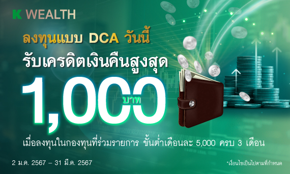 ขึ้นปีใหม่ทั้งที K WEALTH มีโปรโมชั่นมาฝากนักลงทุนทุกคน เมื่อลงทุนแบบ DCA วันนี้ รับเครดิตเงินคืนสูงสุด 1,000 บาท เมื่อลงทุนในกองทุนที่ร่วมรายการ ขั้นต่ำเดือนละ 5,000 ครบ 3 เดือน สนใจรับโปรโมชั่นได้แล้วตั้งแต่วันที่ 2 ม.ค. – 31 มี.ค. 67