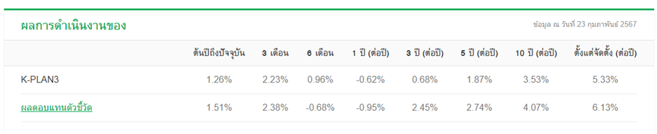 สมมติว่า นาย ก. มีเงินเย็นทิ้งไว้ในเงินฝากออมทรัพย์อยู่ 500,000 บาท อยากหาทางเลือกเพิ่มผลตอบแทน ให้ได้ประมาณ 5% ลงทุนได้นาน 3-5 ปีขึ้นไป รับความผันผวนได้ปานกลาง ไม่มีเวลามาติดตามการลงทุน จากกรณีนี้ อาจพิจารณาทางเลือกการลงทุนเป็นกองทุนรวมผสมที่มีการลงทุนในตราสารหนี้และหุ้นอย่าง K-PLAN3 โดยหากดูผลตอบแทนย้อนหลังตั้งแต่จัดตั้งจนถึงปัจจุบัน (ณ 23 ก.พ.2567) K-PLAN3 มีผลตอบแทน 5.33% ต่อปี