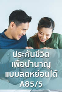 ประกันชีวิตเพื่อบำนาญแบบลดหย่อนได้ A85/5 เป็นตัวช่วยที่ตอบโจทย์ให้เรามีเงินบำนาญไว้ใช้ในวัยเกษียณ เพราะมีเงินคืนให้ทุกปี ปีละ 20% ของทุนประกัน ตั้งแต่อายุ 55 - 85 ปี เช่น ต้องการเงินบำนาญหรือเงินคืนปีละ 1 แสนบาท ก็ทำทุนประกัน 5 แสนบาท เพื่อให้ได้รับเงินคืนปีละ 1 แสนบาท ตั้งแต่อายุ 55 - 85 ปี รวมเงินคืน 3.1 ล้านบาท (ค่าเบี้ยปีละ 258,080 บาท กรณีเพศชาย อายุ 35 ปี)