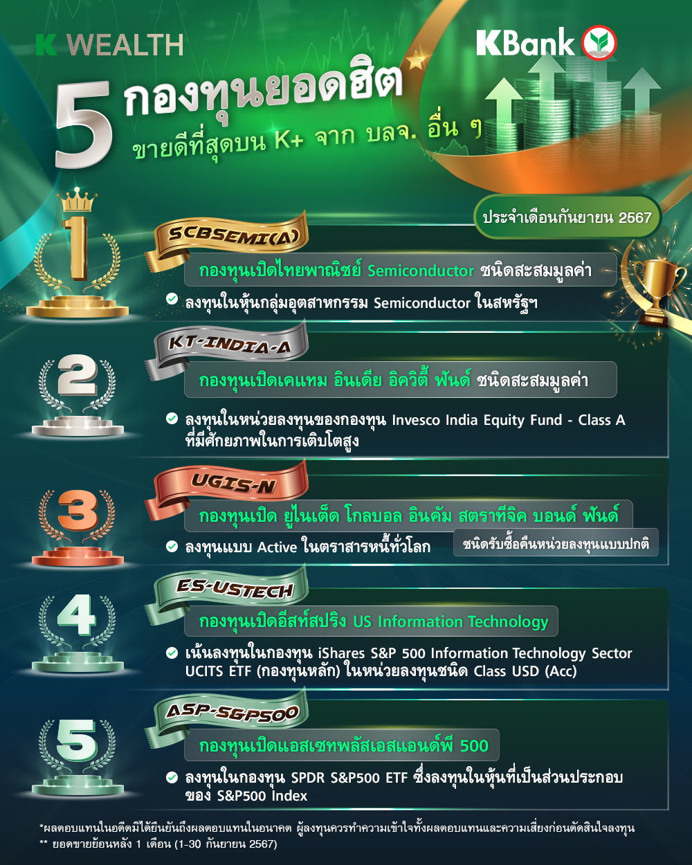 5 กองทุนยอดฮิต ขายดีที่สุดบน K PLUS ประจำเดือนสิงหาคม 2567 ที่นักลงทุนไม่ควรพลาด! 🏅