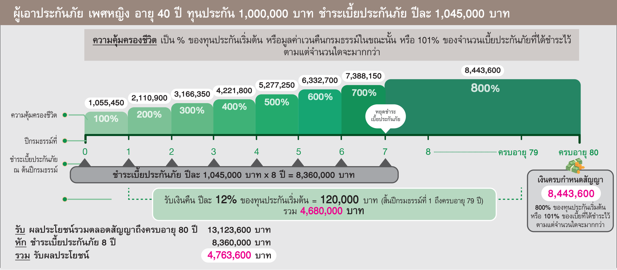 เพศหญิง อายุ 40 ปี ทำประกันชีวิต 80/8 Big Bonus จำนวนเงินเอาประกันภัย 1,000,000 บาท จ่ายเบี้ยประกันปีละ 1,045,000 บาท เป็นเวลา 8 ปี รวม 8,360,000 บาท