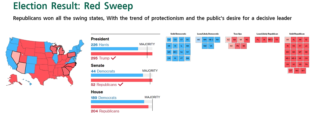 หลังผลการเลือกตั้งฯออกมาตลาดหุ้นสหรัฐฯปรับตัวขึ้น โดยดัชนี Down Jones ปรับขึ้น 3.57% อยู่ระดับ 43,729.93 จุด ดัชนี S&P 500 ปรับขึ้น 2.53% อยู่ระดับ 5,929.04 จุด ดัชนี Nasdaq ปรับขึ้น 2.93% อยู่ระดับ 18,978.65 จุด รับมาตรการการลดภาษีนิติบุคคล