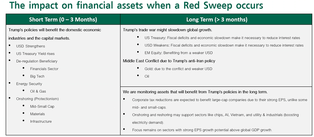 มาตรการต่าง ๆ ตามนโยบาย “Make America Great Again!” ของทรัมป์เป็นปัจจัยบวกหนุนตลาดหุ้นสหรัฐฯปรับตัวขึ้นในระยะสั้น โดยเฉพาะนโยบายปรับลดอัตราภาษี การผ่อนคลายกฎระเบียบในภาคการเงิน และการใช้จ่ายทางการคลัง เช่น ลงทุนโครงสร้างพื้นฐาน จะช่วยกระตุ้นเศรษฐกิจสหรัฐฯ และหนุนผลประกอบการของบริษัทจดทะเบียนในตลาด แต่กว่าจะเห็นผลกระทบที่แท้จริงของนโยบายต่อเศรษฐกิจคงอาจจะต้องใช้เวลา
