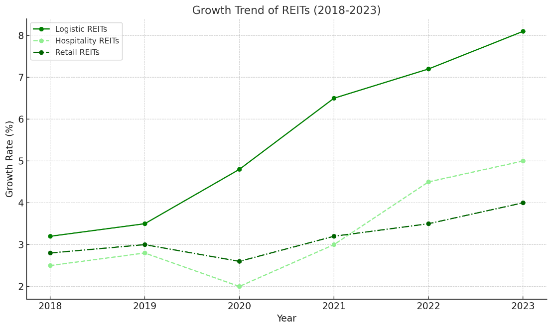 • Hospitality REITs: การฟื้นตัวของการท่องเที่ยวในภูมิภาคต่าง ๆ ช่วยเพิ่มอัตราการเข้าพักในโรงแรมและรีสอร์ต ซึ่งส่งผลทำให้รายได้ของ REITs ในกลุ่มนี้เพิ่มขึ้น